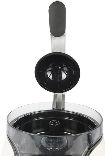 Отметим наличие на насадке двух пластиковых лепестков. Во время вращения конуса они сдвигают с сита мякоть цитрусовых, затрудняющую слив сока в лоток.
