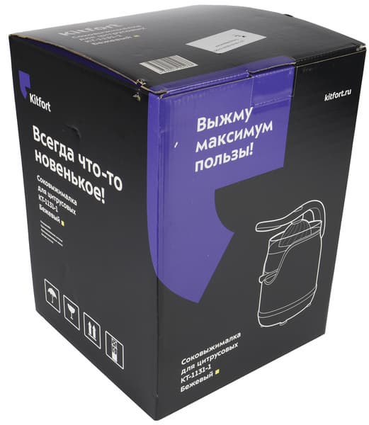 Соковыжималка Kitfort KT-1113 упакована в небольшую коробку, выполненную в фирменной стилистике Kitfort. На упаковке видны традиционные элементы хорошо знакомого дизайна — логотип, слоган, название прибора, его модель и векторное изображение прибора. На боковых сторонах можно ознакомиться с техническими характеристиками и описанием соковыжималки. Коробка не перегружена информацией, однако все важные сведения представлены. Ручки для переноски в данном случае не предусмотрено.