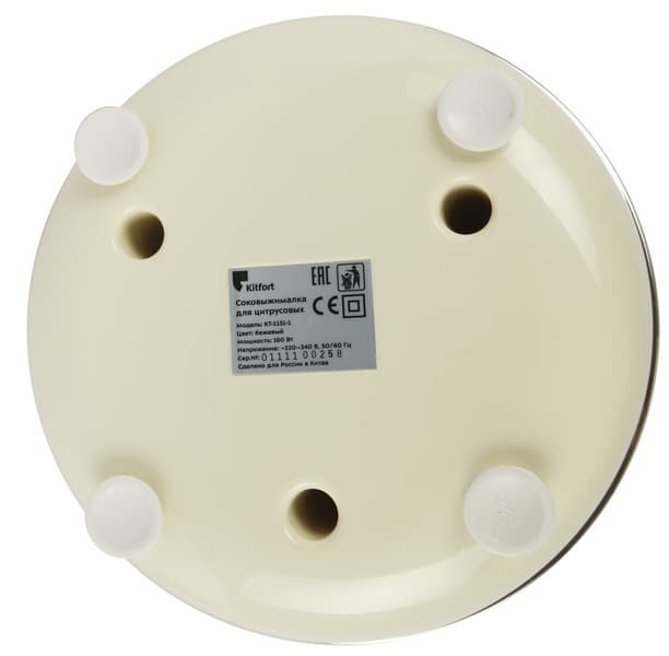 Прибор оснащен четырьмя ножками-присосками, благодаря которым корпус надежно сцепляется с поверхностью стола, находится в неподвижности и не сдвигается во время работы. Шнур питания выходит с тыльной стороны. Отсека для его намотки не предусмотрено. Снизу мы также видим наклейку с технической информацией о соковыжималке.