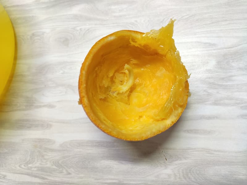 Кожура апельсинов оказалась выжата досуха. При этом насадка для отжима не срывала мякоть с внутренней стороны шкурки, а деликатно выдавливала сок, не повреждая цитрусовые.
