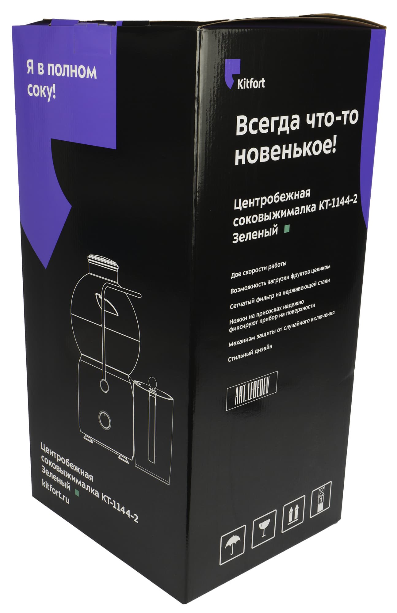 Соковыжималка Kitfort KT-1144 поставляется сразу в двух коробках внушительного размера (304×274×601 мм).