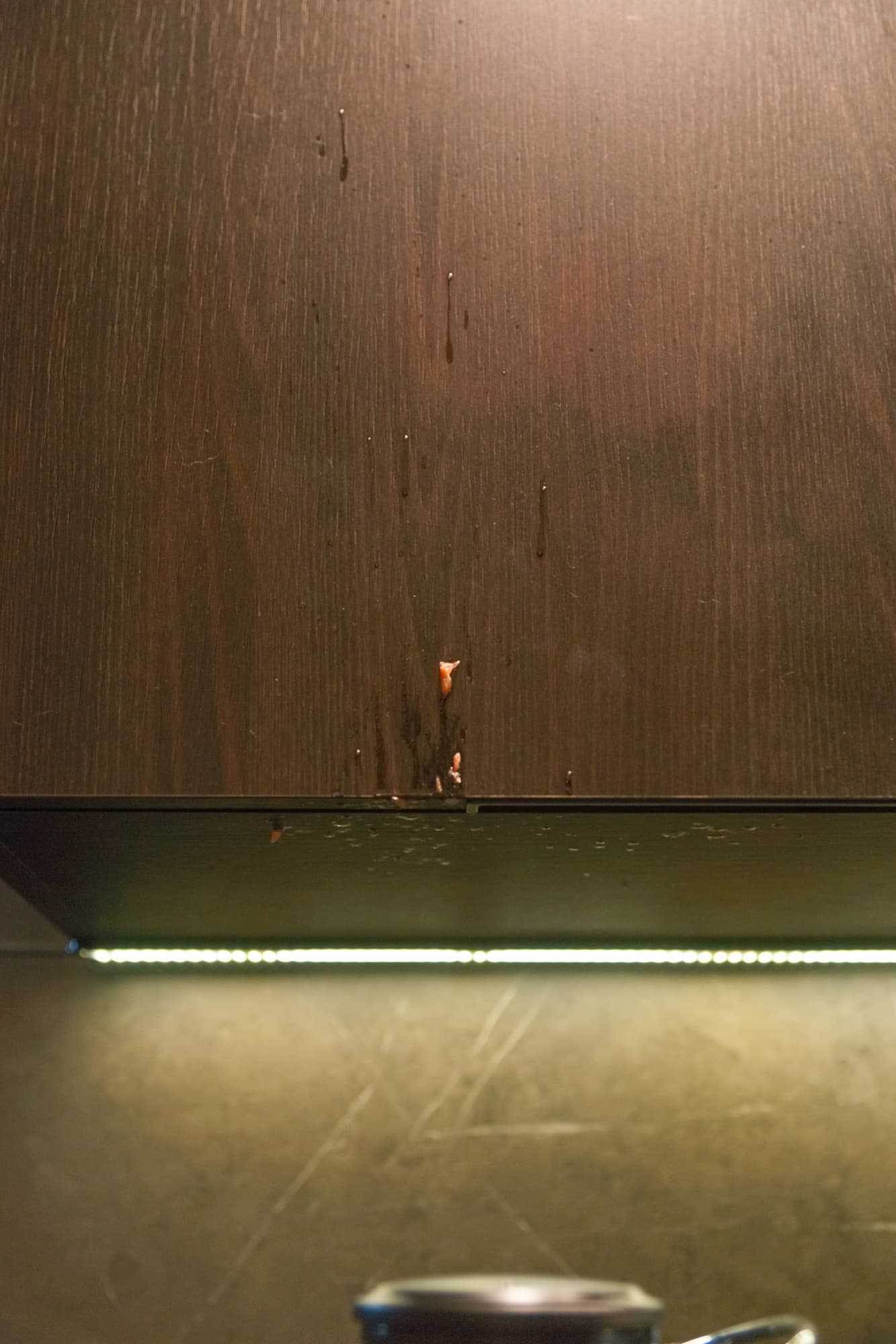 Они достали до верхнего шкафчика и частично повылетали на пол, а всё потому, что мы вовремя не прикрыли отверстие толкателем. Но даже когда успеваешь вовремя закрыть горловину, совсем мелкие частички все равно летят на стол и на пол.