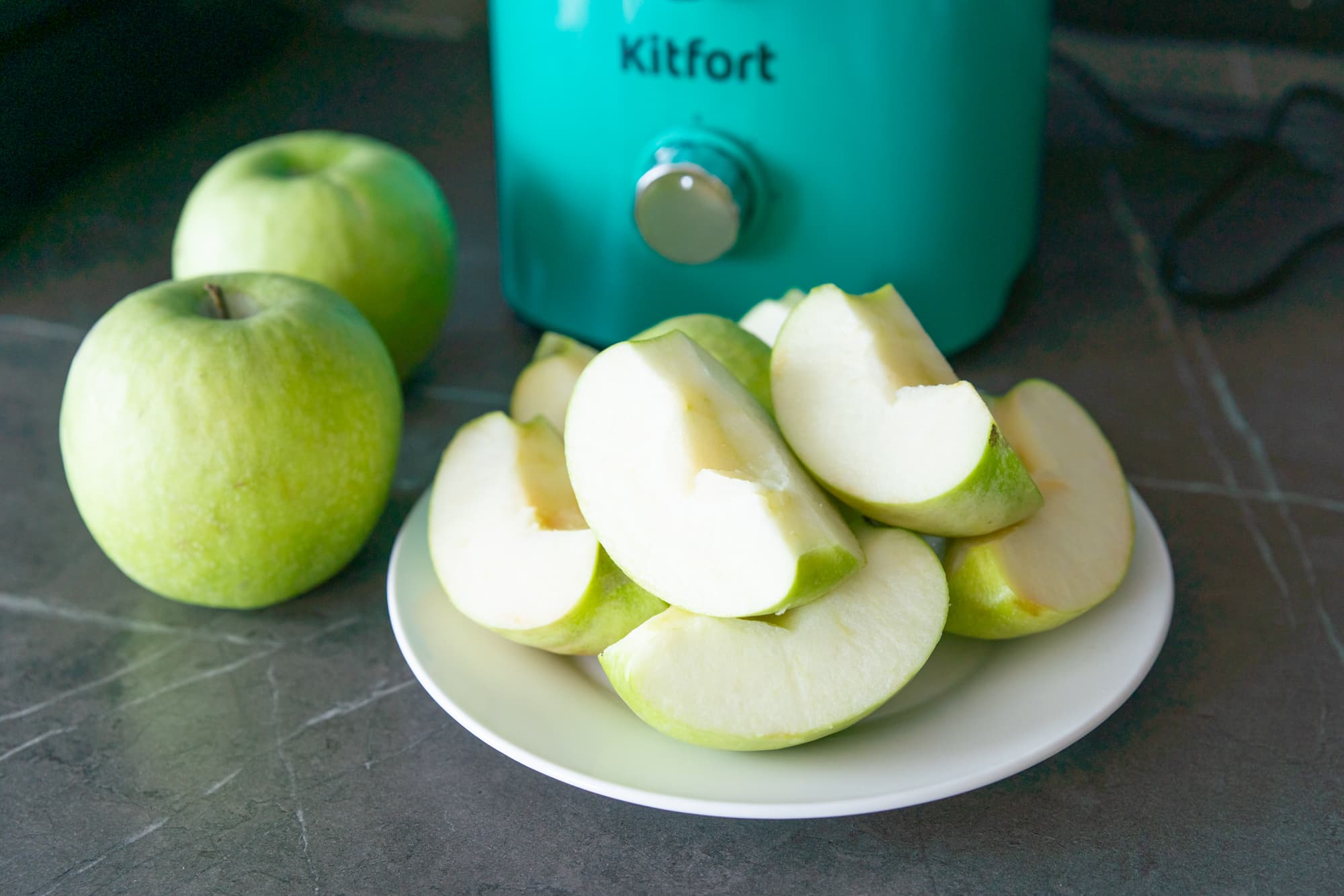 Яблоки сорта «Гренни Смит» мы нарезали на четыре части, убрав из них сердцевину и взвесив ровно 1 килограмм.