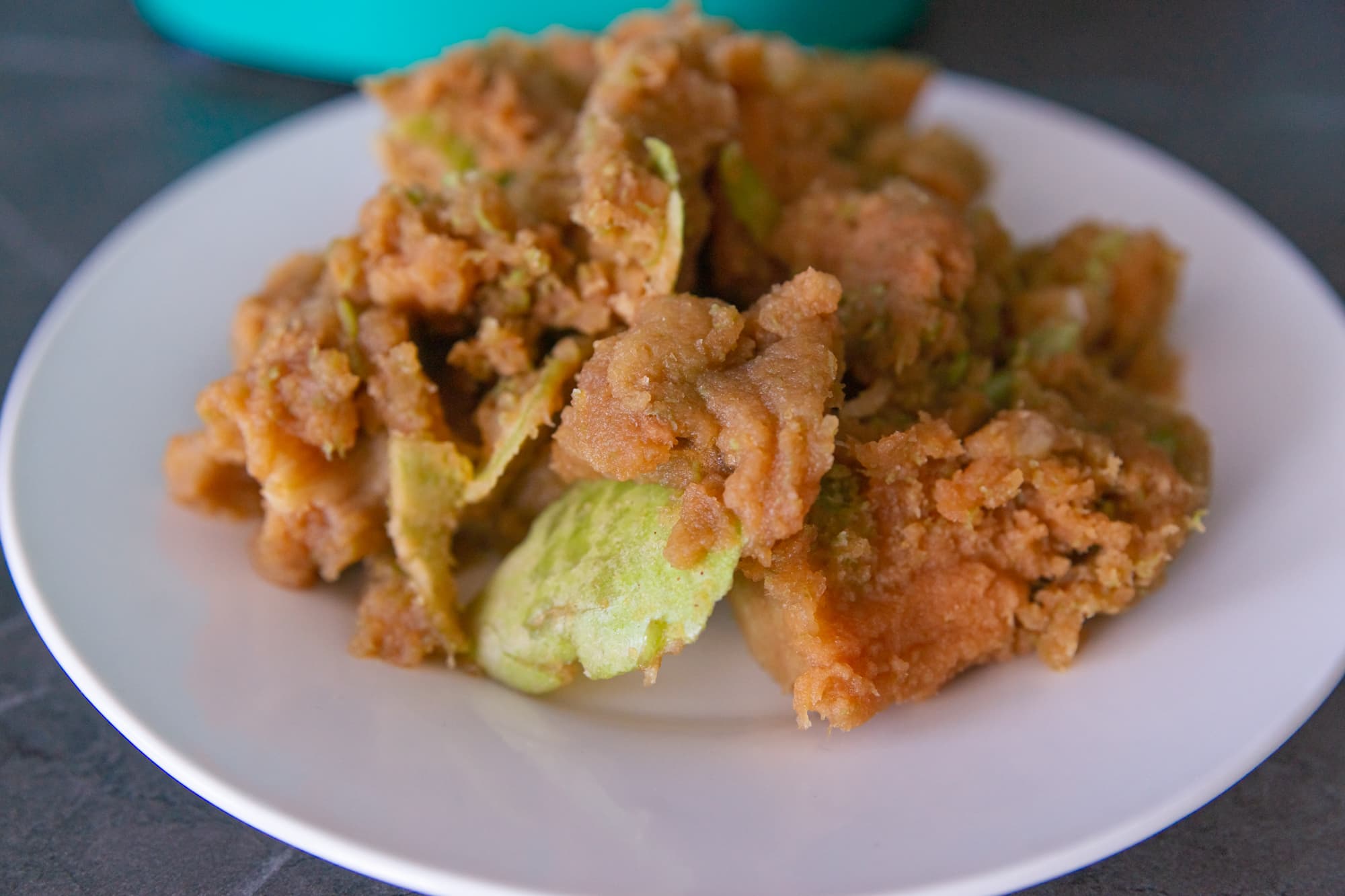 В процессе толкателем нужно пользоваться обязательно. В противном случае кусочки продуктов, отскакивающие от вращающейся терки, могут вылетать далеко за пределы горловины. На фото ниже видно, как разлетелись частички яблока.