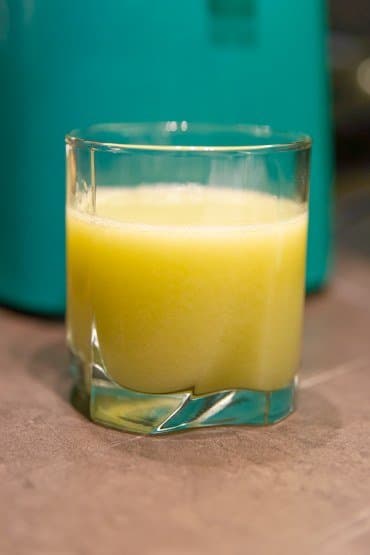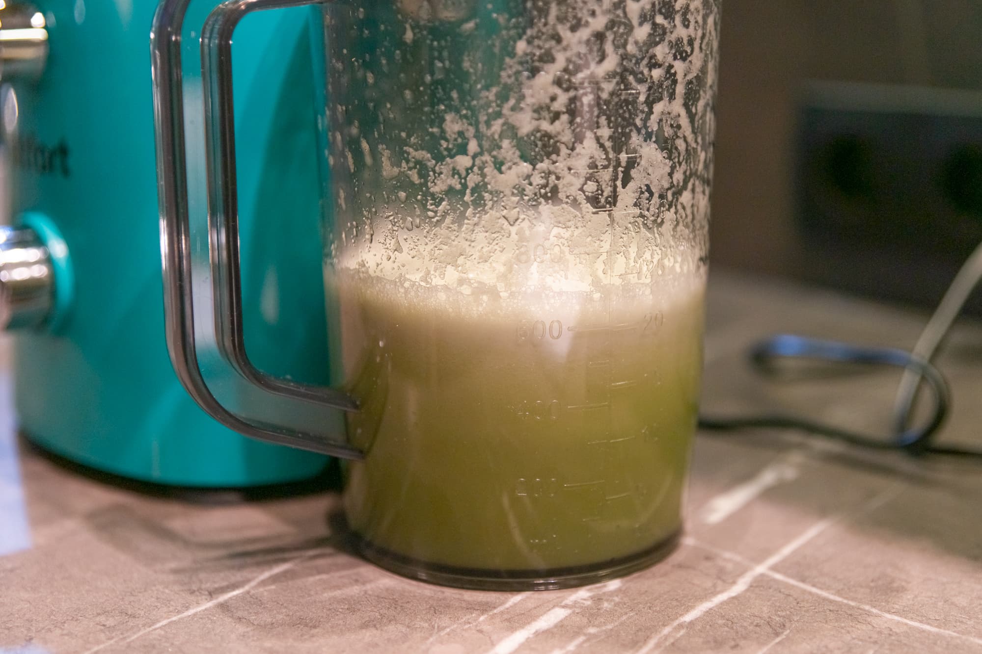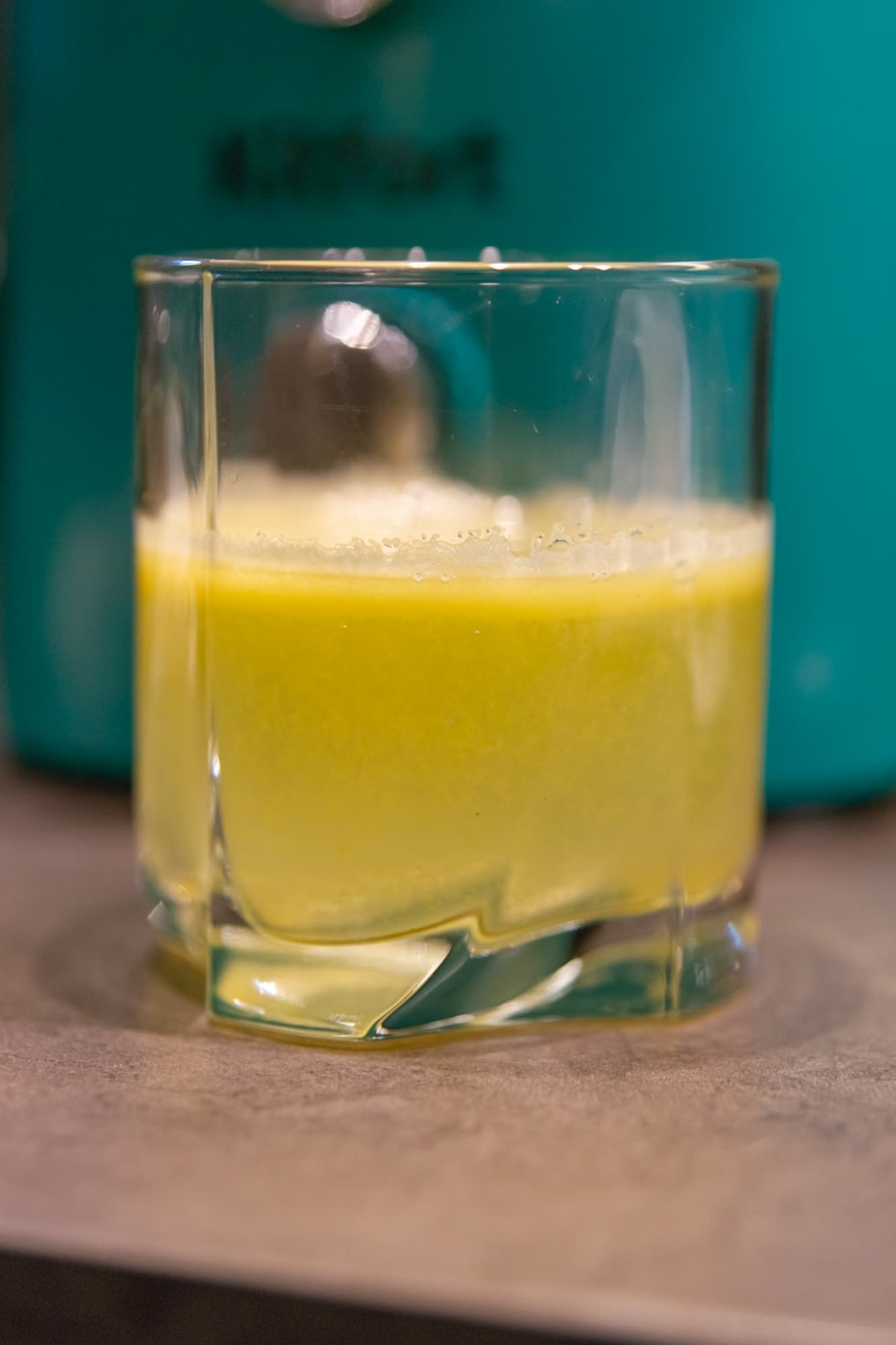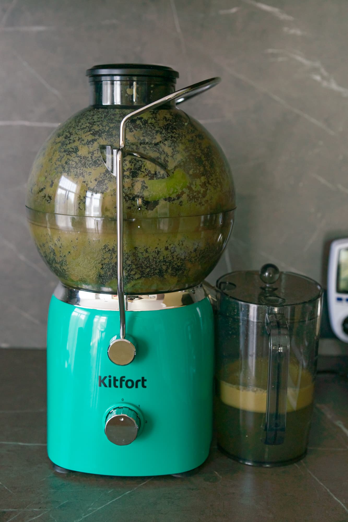 Быстро, шумно и с вылетающими из горловины частичками фруктов мы получили прозрачный сок с густой шапкой пены.