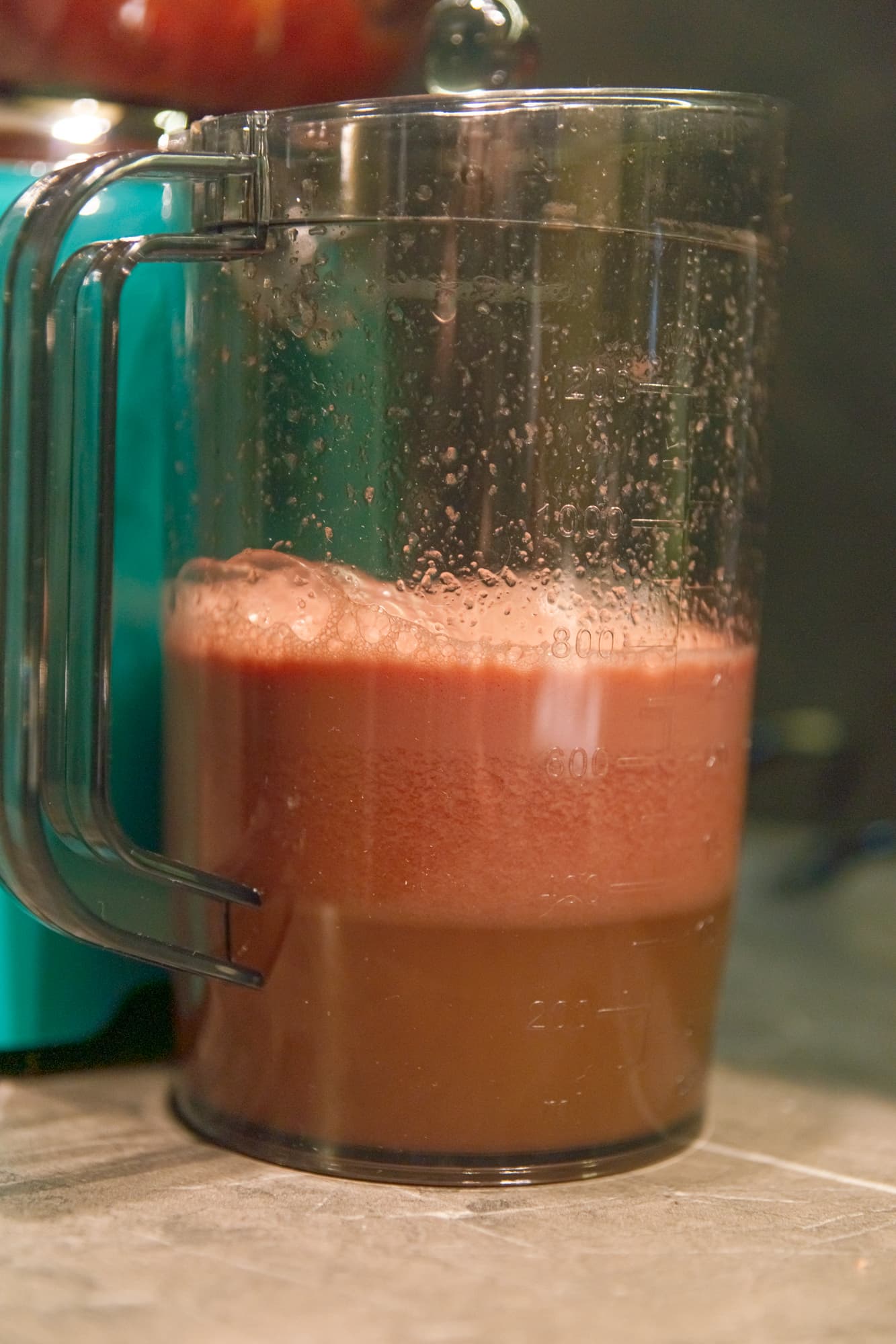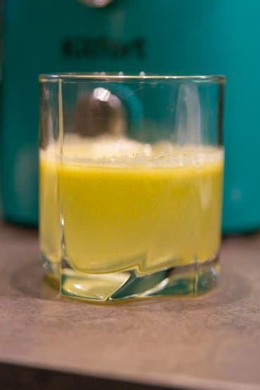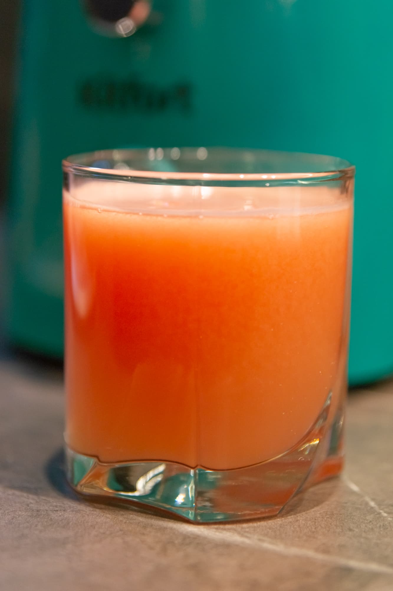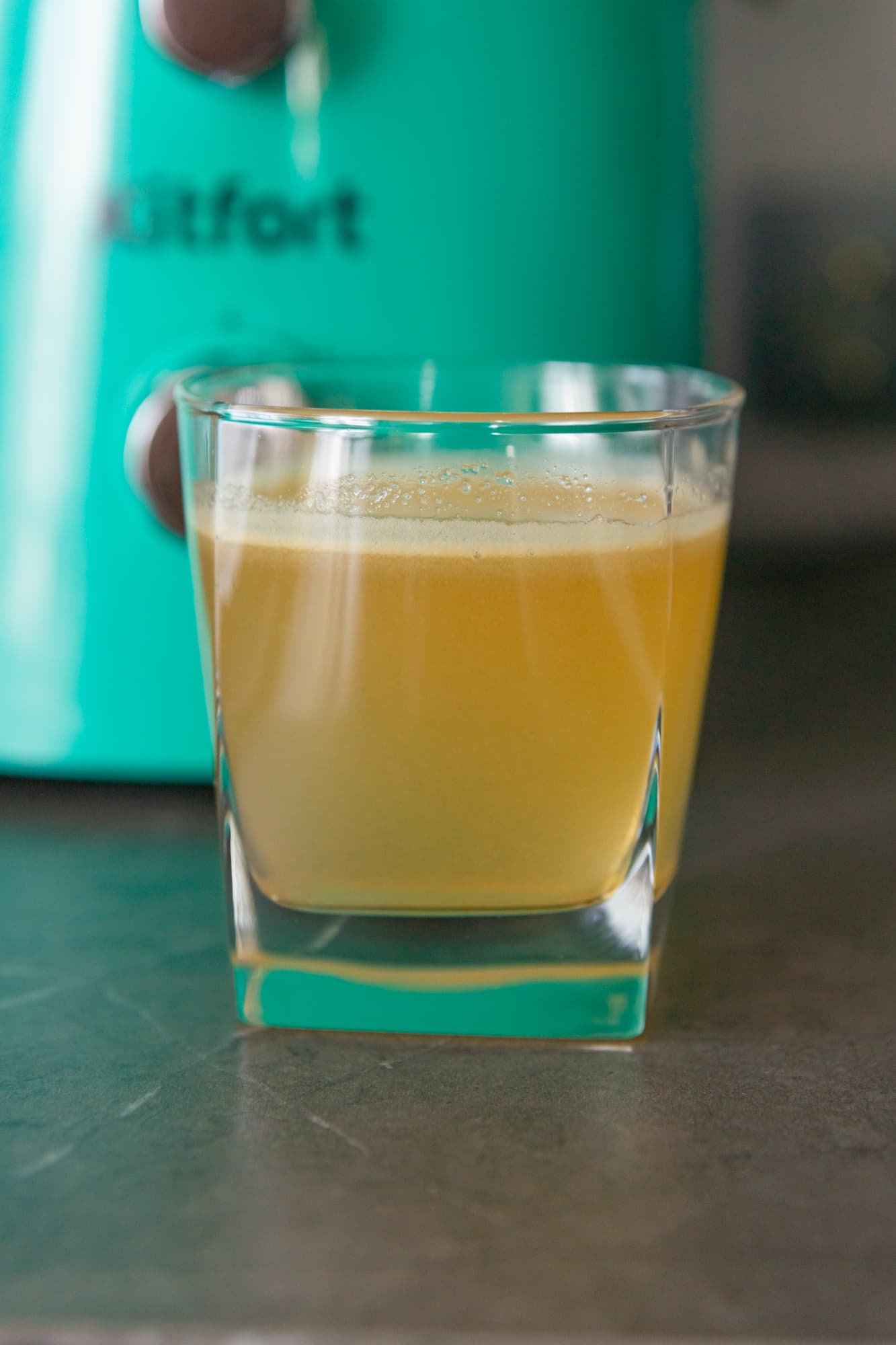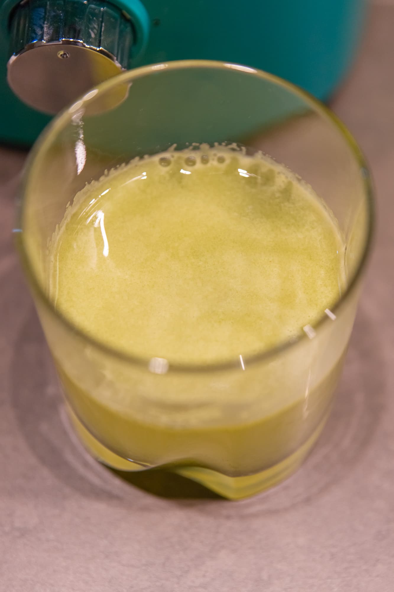 Быстро, шумно и с вылетающими из горловины частичками фруктов мы получили прозрачный сок с густой шапкой пены.
