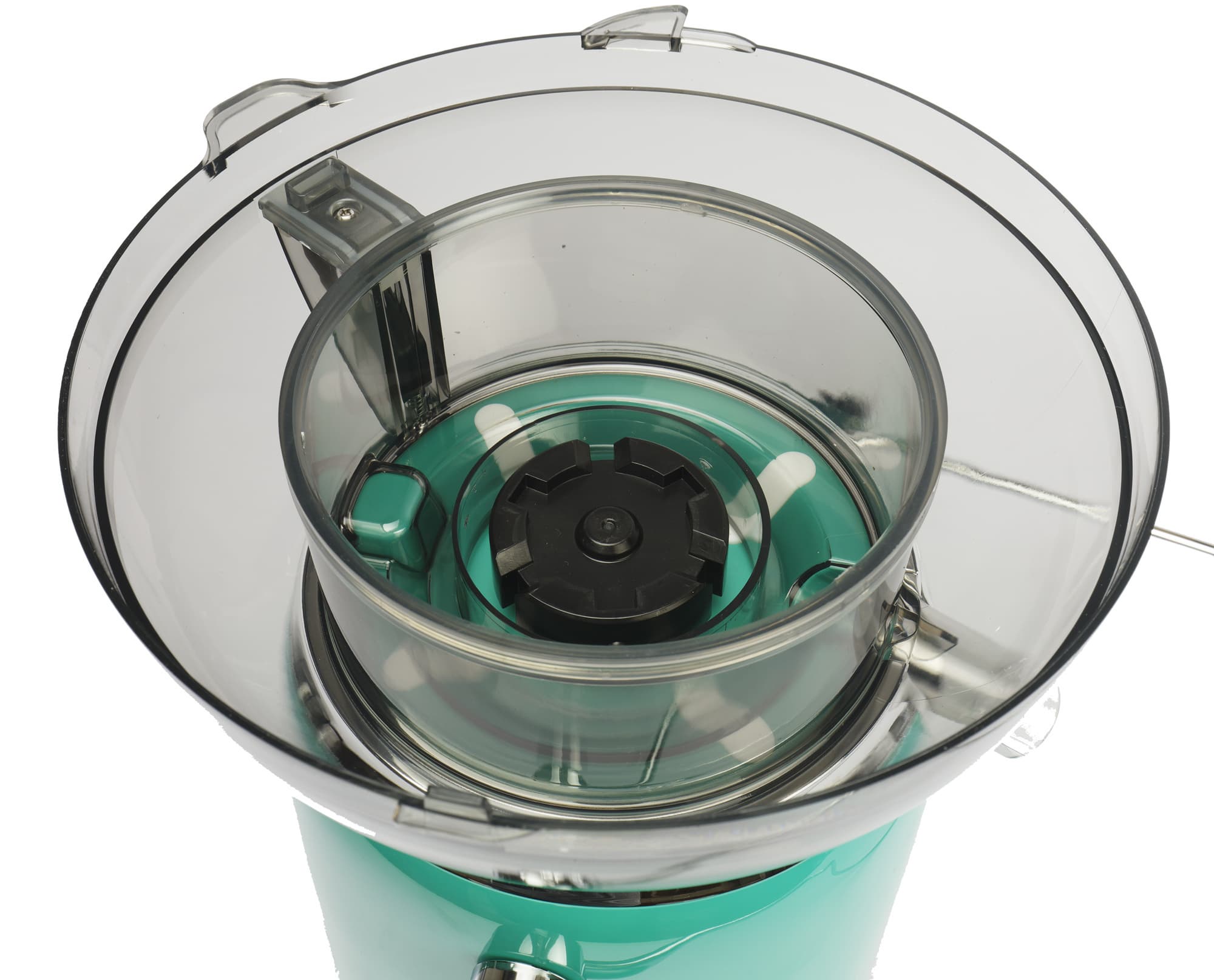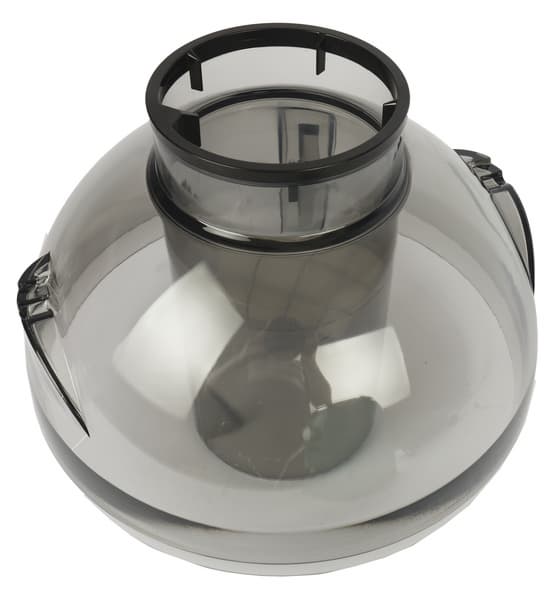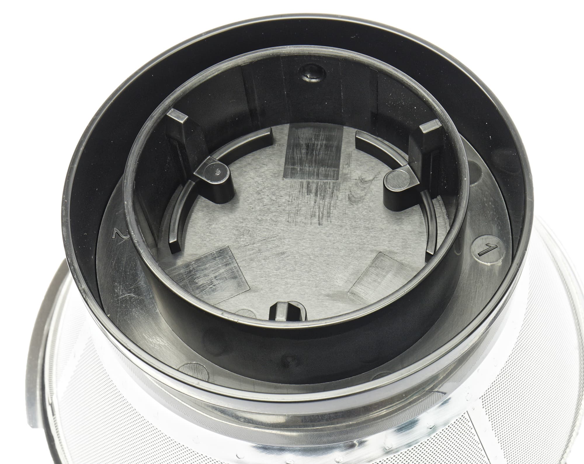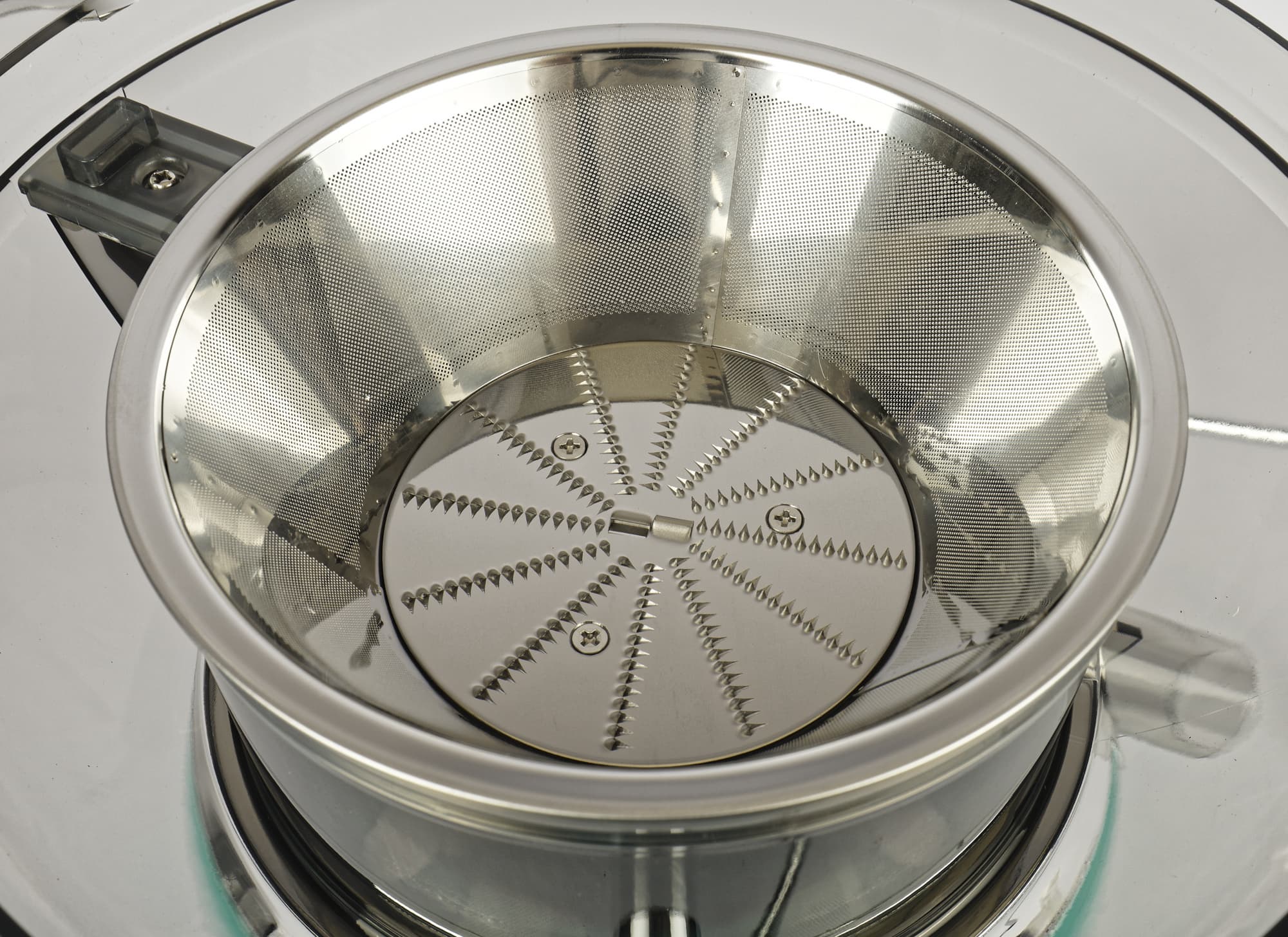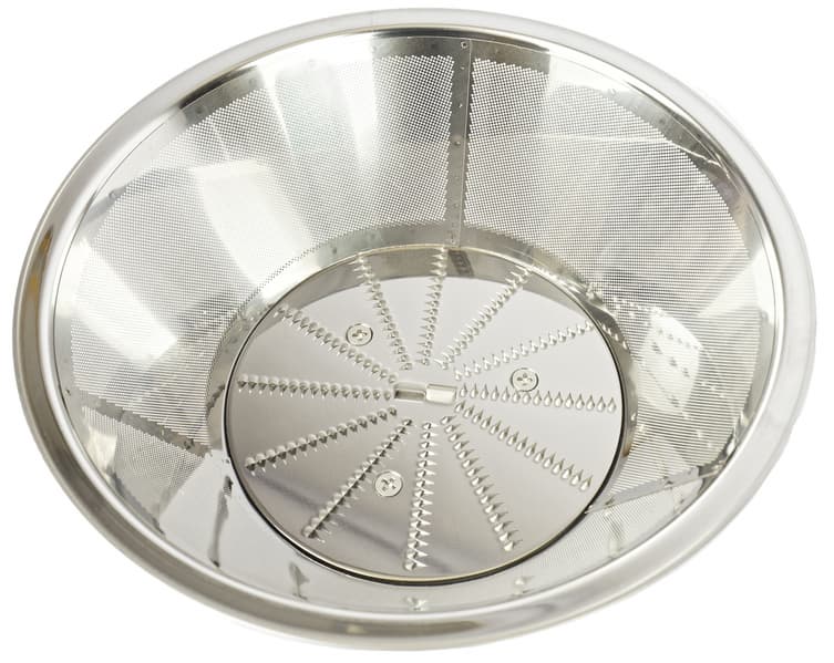На моторный блок устанавливается пластиковая прозрачная чаша, а в нее помещается мелкосетчатый фильтр с теркой. Соединение вала двигателя с отжимающей сеткой — пластик/пластик.