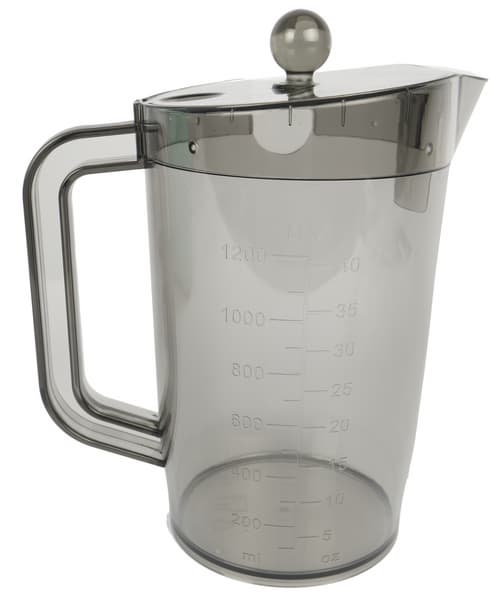 Емкость из темно-серого прозрачного пластика имеет риски в ml и oz. Максимальный объем составляет 1200 мл. Закрывается кувшин крышкой с отсекателем пены.