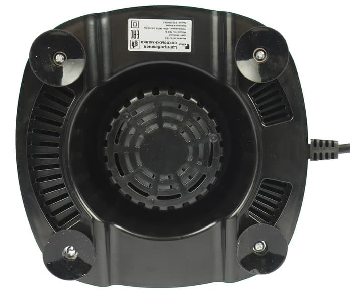 Моторный блок с переключателем скоростей очень устойчиво располагается на поверхности стола благодаря четырем ножкам-присоскам. По центру на дне размещены вентиляционные отверстия, рядом — наклейка с технической информацией. Метровый шнур электропитания выходит из задней стенки корпуса.