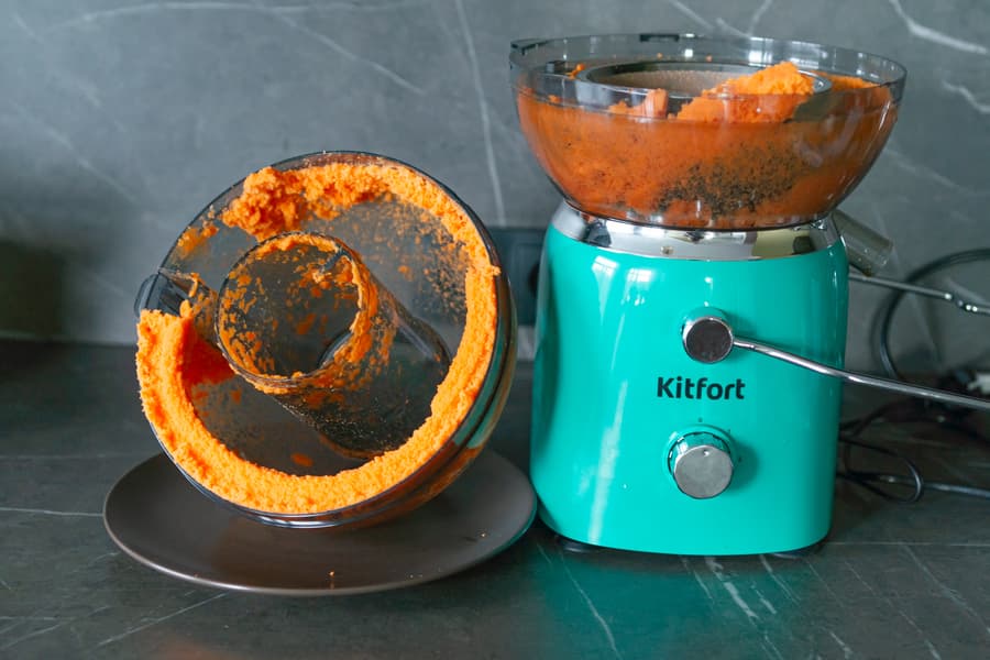 Потребляемая мощность Kitfort KT-1144 зависит от жесткости перерабатываемого сырья и скорости работы. На первой скорости в среднем она колебалась в районе 350 Вт, на второй — от 630 до 690 Вт.