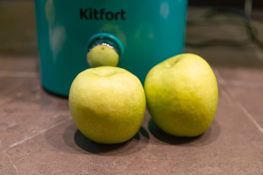 Теперь посмотрим, как пройдет переработка целых фруктов с косточками. Мы взяли два яблока общим весом 400 г, по размеру впритык проходящих в горловину.