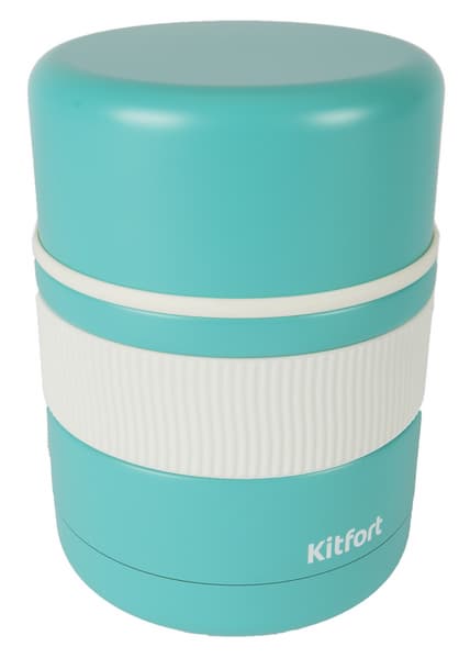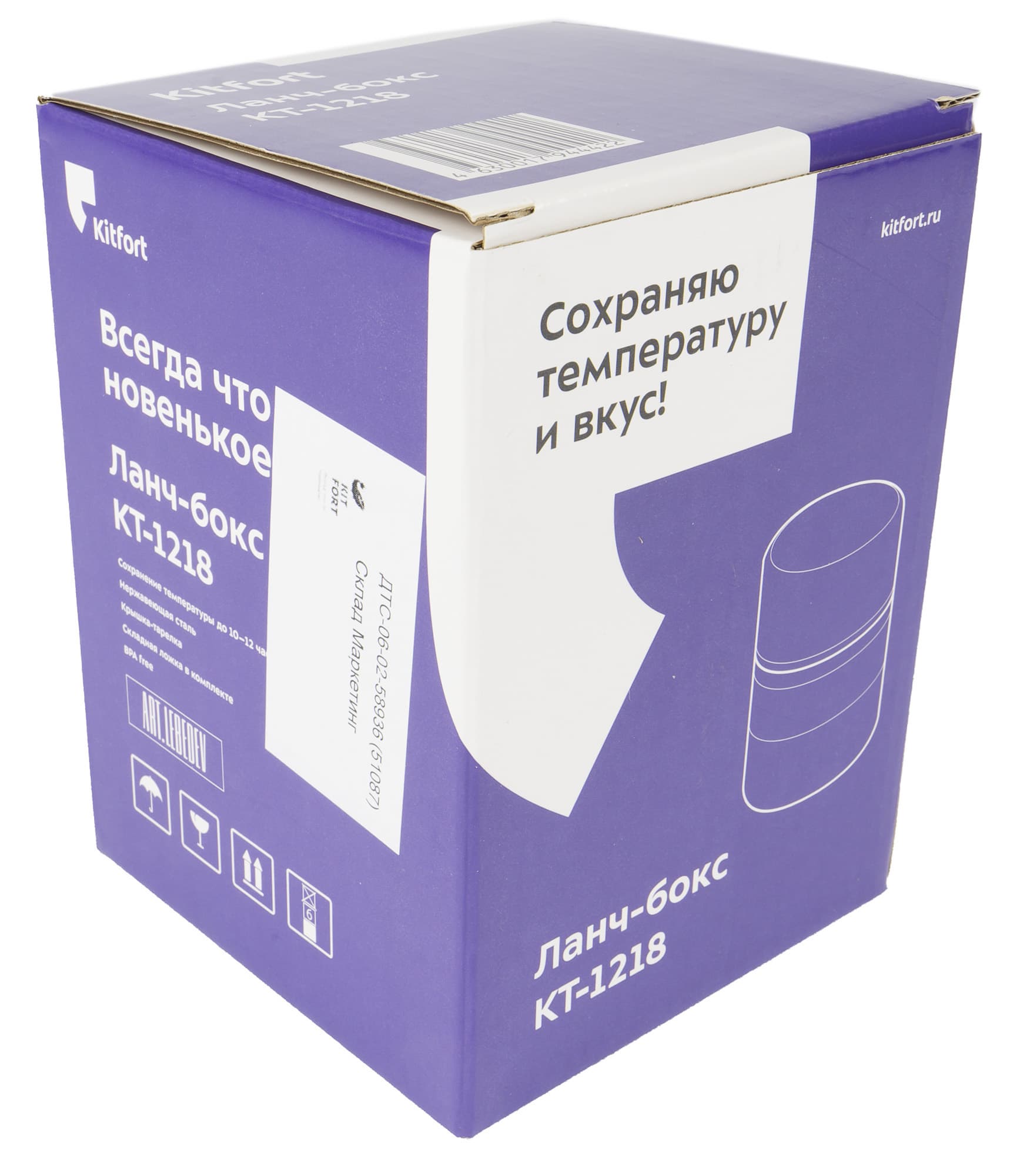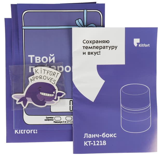 Ланч-бокс упакован в небольшую картонную коробку, оформленную в фирменном стиле производителя. На лицевой ее стороне размещается векторное изображение изделия, индекс модели, ссылка на сайт, а также слоган, свой для каждого класса продукции Kitfort. Для ланч-боксов выбран девиз «Сохраняю температуру и вкус!».
