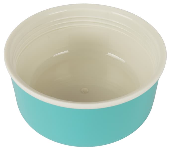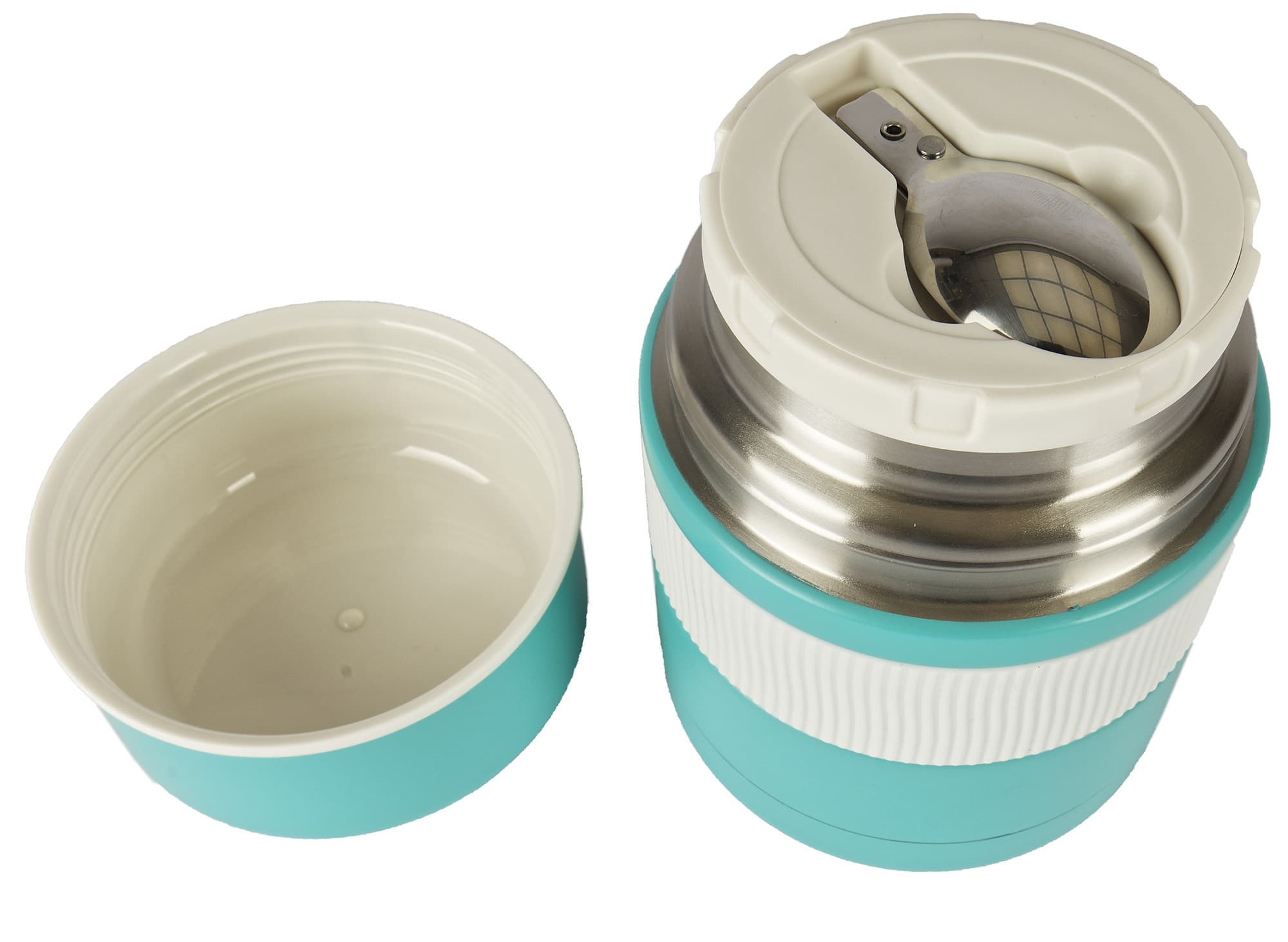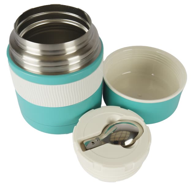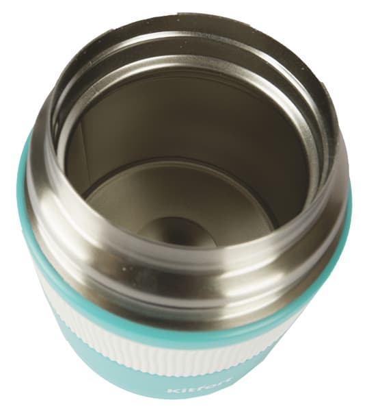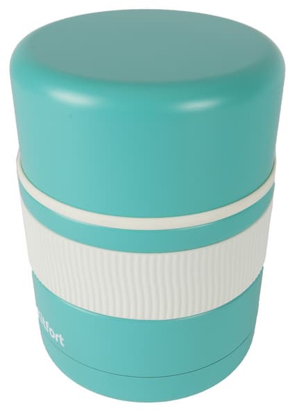 Ланч-бокс представляет собой широкогорлый термос в пластиковом корпусе, оформленном в светло-бирюзовом и сливочном тонах. Его среднюю часть опоясывает резиновая полоса с рифлением, которое позволяет удобно удерживать и открывать изделие даже влажными руками.