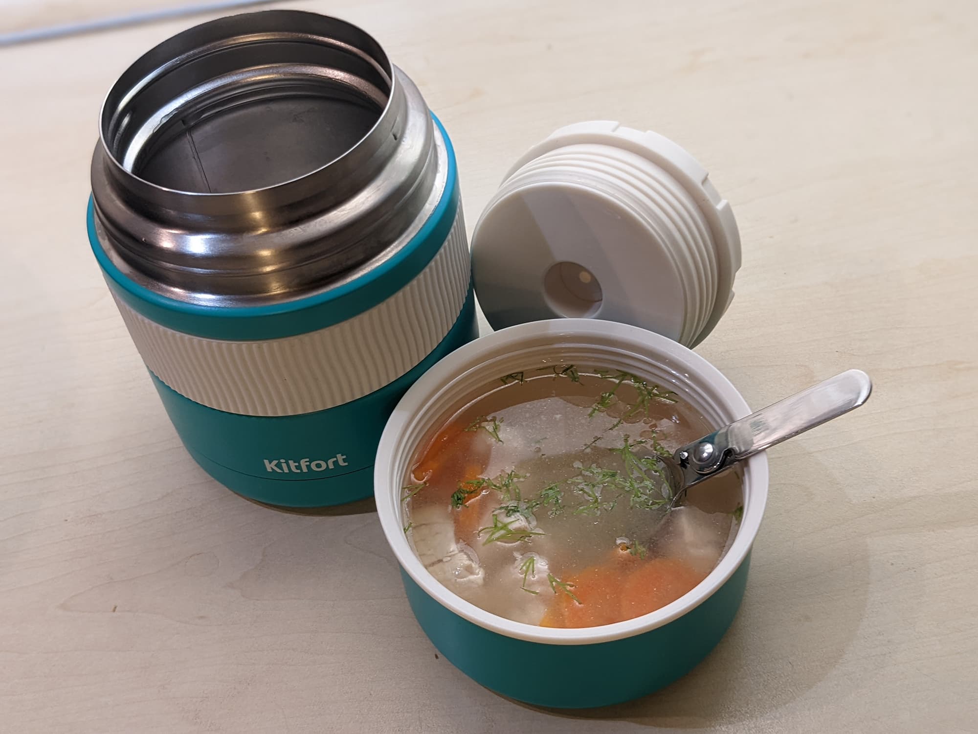 В процессе тестирования мы неоднократно заполняли Kitfort KT-1218 жидкой и полужидкой горячей едой. Супы, бульоны и те блюда, которым не повредит перемешивание, в нем переносить просто отлично: даже после долгой переноски в сумке жидкость не протекает (если перевернуть вверх тормашками и некоторое время носить так — тоже).