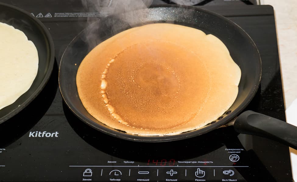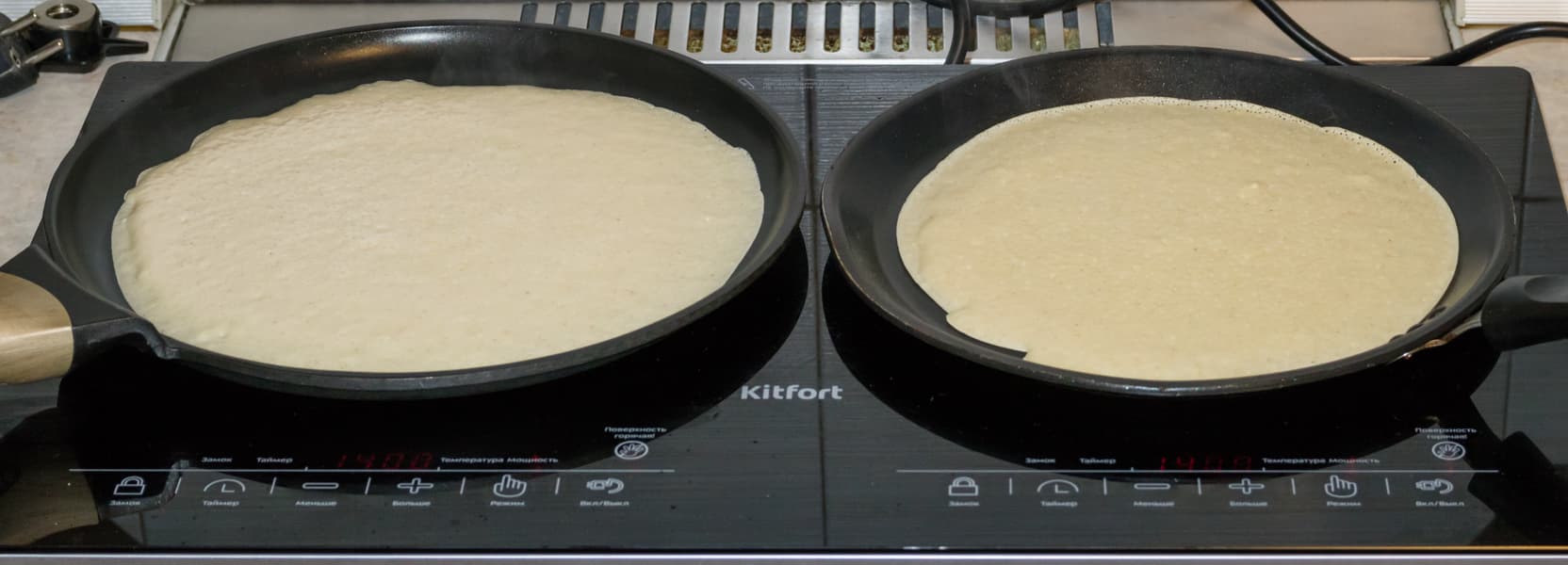 Диаметры блинных сковородок разные: большая контактирует с конфоркой на 20 см, при этом ее верхний диаметр — 29 см, вторая, поменьше, с диаметром дна в 21 см, сверху — 26 см. Сковородки без проблем разместились на плитке, не мешали и не задевали друг друга при манипуляциях в процессе жарки блинов. Большую сковороду поставили на левую, мощную, конфорку, вторую — на правую. Обе конфорки запустили на 1400 Вт.