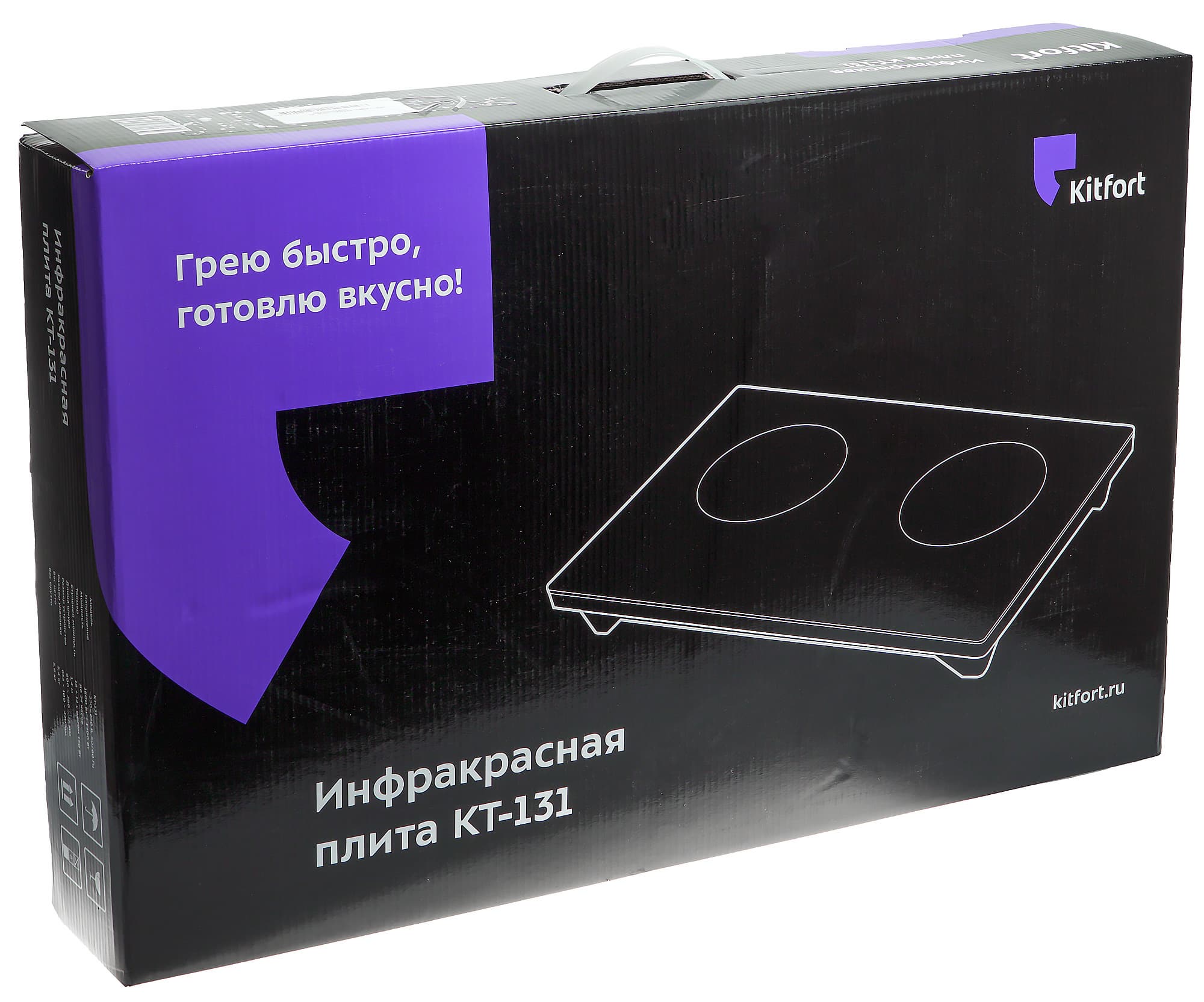 Плитка поставляется в прочной картонной коробке, оформленной в узнаваемом стиле Kitfort: черный фон, яркие пятна фиолетового, схематическое изображение прибора и краткая, необходимая для первого знакомства, информация. Коробка оснащена пластиковой ручкой для переноски. Учитывая не чрезмерный вес прибора и величину упаковки, это решение можно признать крайне удачным.