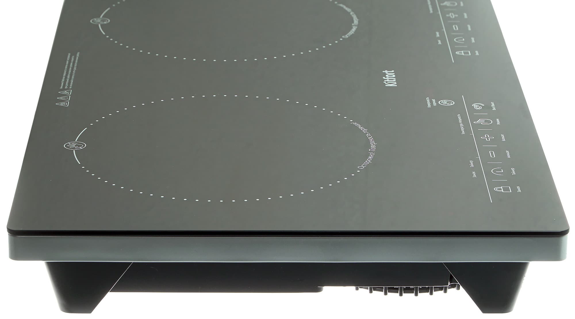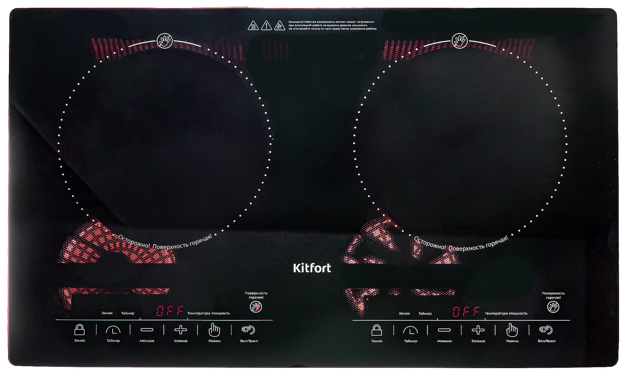 Поверхность плитки изготовлена из затемненного стекла, зоны нагрева обозначены окружностями, вдоль которых нанесена предупреждающая надпись «Осторожно! Поверхность горячая!». Ближе к пользователю размещена панель управления каждой из конфорок. Сенсорные кнопки которой снабжены однозначно трактуемыми пиктограммами.