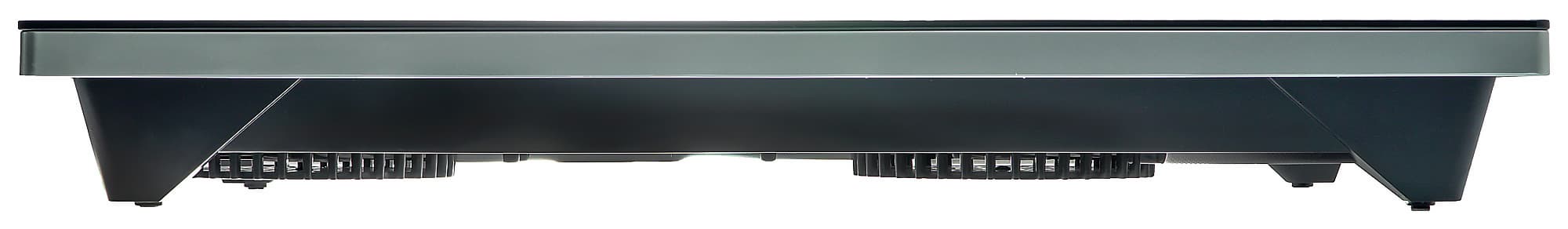 Заподлицо с краем стеклокерамической поверхности оформлена боковая сторона плитки, изготовлена из пластика серебристого цвета. Выглядит весьма достойно. В глубине снизу виден корпус плитки черного цвета.