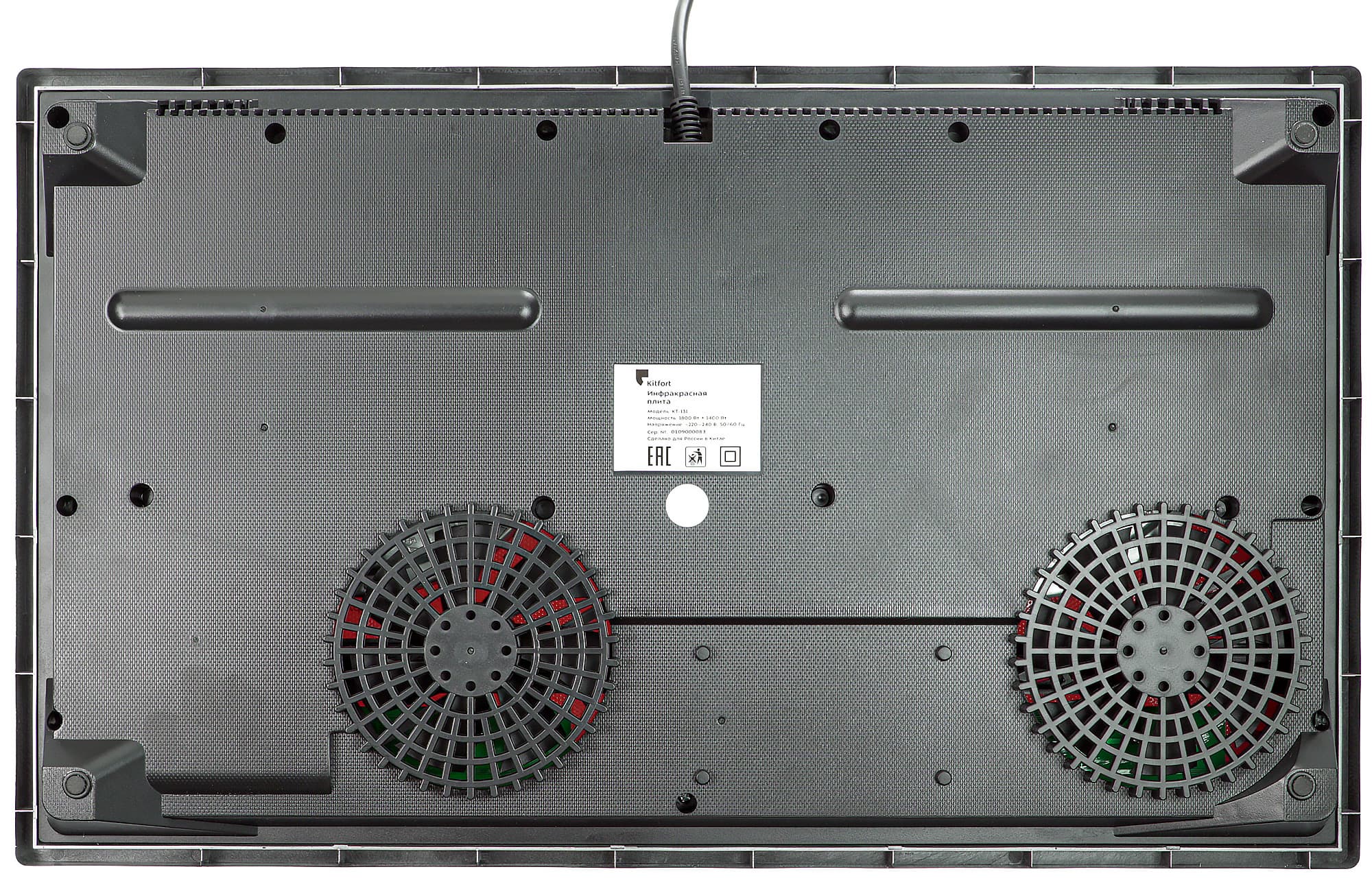 По центру тыльной стороны прикреплен кабель электропитания. Длина в 1,35 м кажется нам достаточной для использования плитки без применения удлинителей. По бокам расположены многочисленные вентиляционные отверстия.