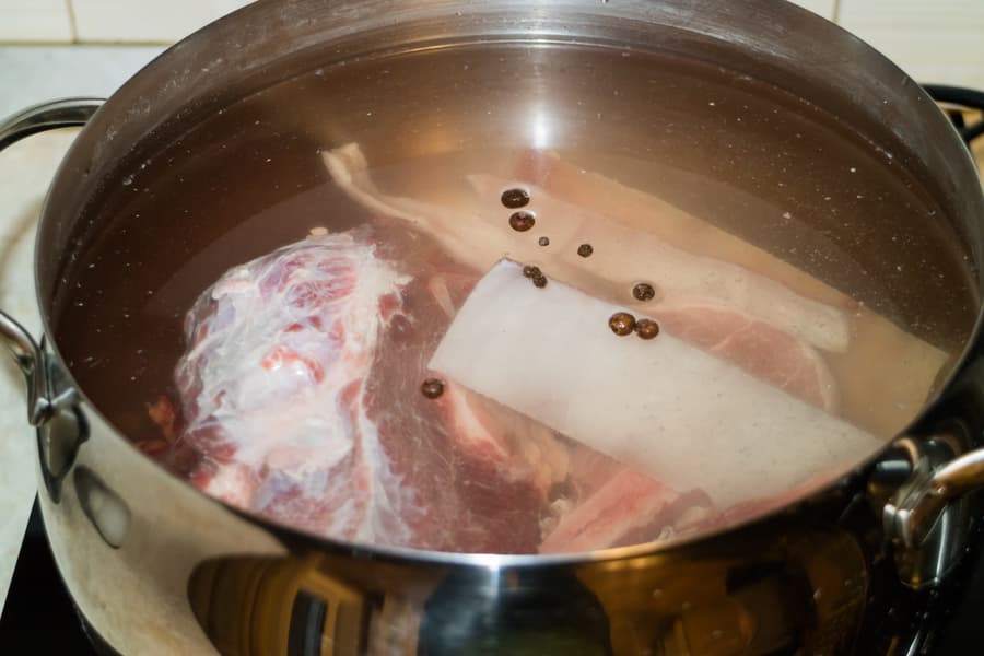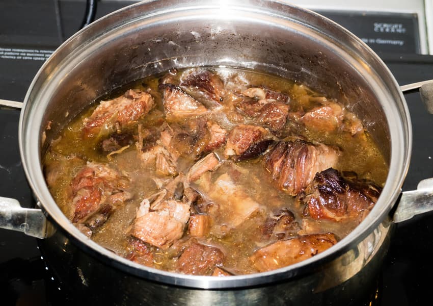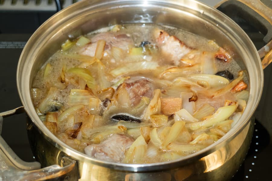 Данный тест продемонстрирует, как плитка справляется с длительным неспешным томлением. В большую пятилитровую кастрюлю поместили говяжье колено, обрезки и кости свинины, оставшиеся от разделки мяса для других блюд, свиную же шкуру. Добавили перец черный, душистый, пару гвоздик, залили водой и поставили на плитку.