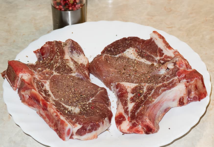 Изначально хотелось поджарить стейк, однако подходящий говяжий отруб стоит совершенно неприличных денег. К тому же нам удалось подружиться с мясником в недавно открывшемся небольшом магазине, поэтому теперь в руки попадают интересные части туши. Так, в этот раз у нас оказалась пара кусочков свинины на кости. Куски очень красивые, достаточно толстые, при наличии косточки отбивать их смысла нет. Поэтому было решено хорошо обжарить мясо так, а потом довести свинину до готовности под крышкой.