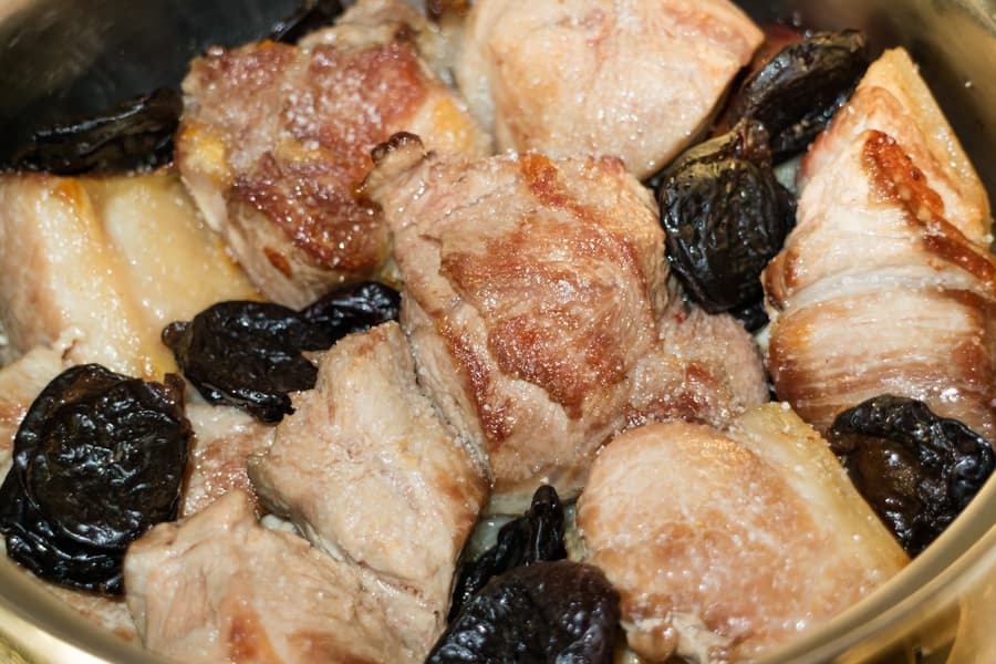 Затем сложили румяные кусочки мяса в кастрюлю, а на оставшемся жиру пожарили одну большую луковицу. Добавили ее к мясу, посолили, всыпали горсть чернослива, а потом вдруг включилась чистая импровизация: немного воды, половник бульона из рядом стоящей кастрюли, немного соевого соуса. Затем в ход пошла молотая гвоздика, корица, кориандр и даже кардамон.