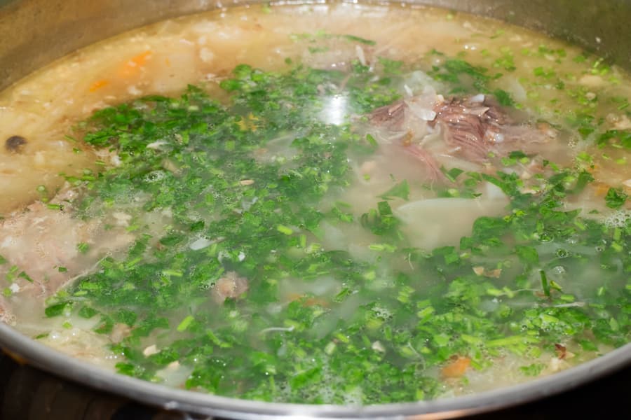 Когда мы подошли к выключившейся по истечении времени плитке, бульон был готов: насыщенный, с хорошо разварившимся коленом. Процедили его, часть отлили и заморозили: пять литров щей — это как-то чрезмерно. Всыпали картошку и продолжили варить щи. Когда картошка и репчатый лук с морковкой (добавленные по ходу варки) были почти готовы, дошла очередь кислой капусты и горсточки гречневой крупы. После закипания уменьшили нагрев до 300 Вт, установили таймер на 25 минут и отошли от плиты. В самом конце добавили черный перец, лавровый лист, немного тмина и свежей петрушки.