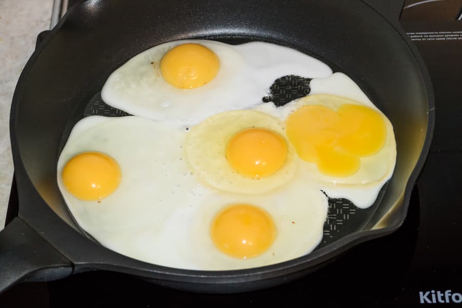 Наиболее простой, но далеко не бесполезный тест, позволяющий оценить скорость и равномерность нагрева конфорки. Для жарки использовали левую, мощную, конфорку и сковороду диаметром 23 см с толстым дном. Включили конфорку на максимальный нагрев, немного подождали, влили масло и вбили пять яиц.
