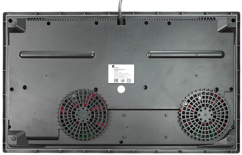 Плитка оснащена парой одинаковых по диаметру одноконтурных конфорок диаметром 20 см. Зона нагрева, то есть диаметр инфракрасного нагревателя, составляет 17,5 см. Мощность конфорок разная: левой — 1800 Вт, правой — 1400 Вт.