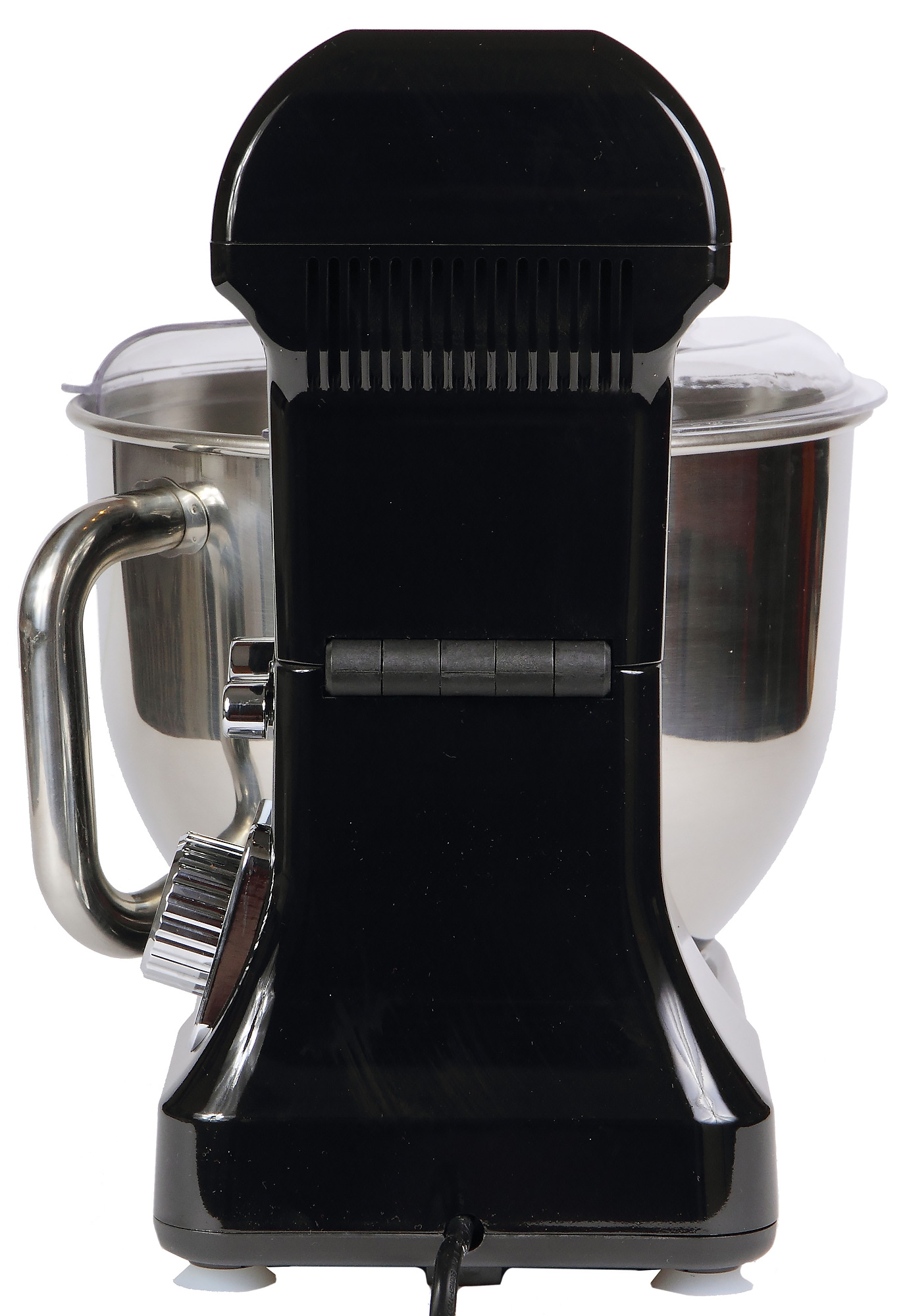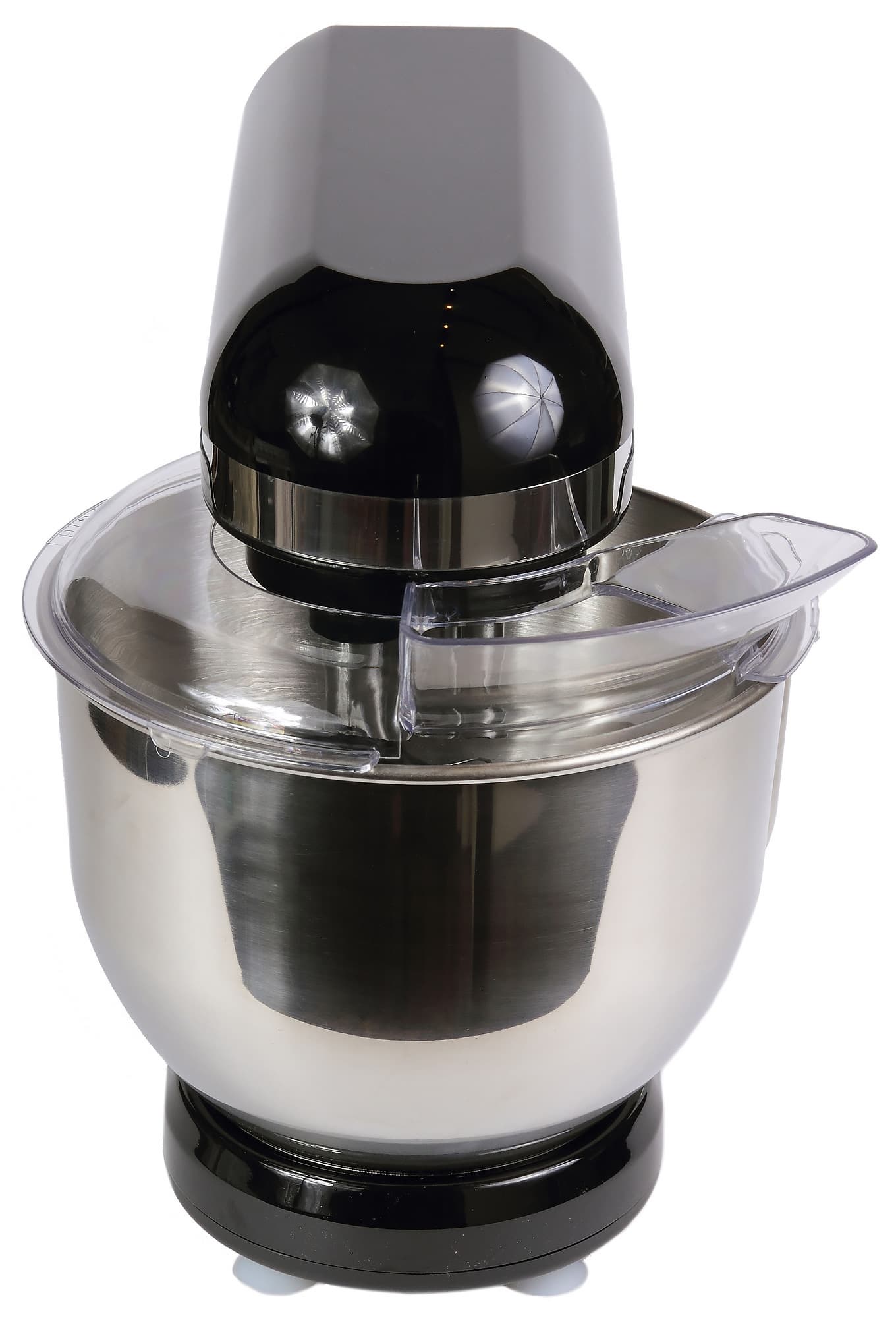 Крышка для чаши изготовлена из прозрачного пластика, что позволит свободно наблюдать за ходом смешивания или взбивания. Она предназначена для защиты внешних поверхностей корпуса и окружающих поверхностей от брызг и распыления ингредиентов. Через высокую и широкую горловину крышки можно добавлять жидкие и сухие продукты прямо во время работы, не выключая мотор и не поднимая откидную головку.