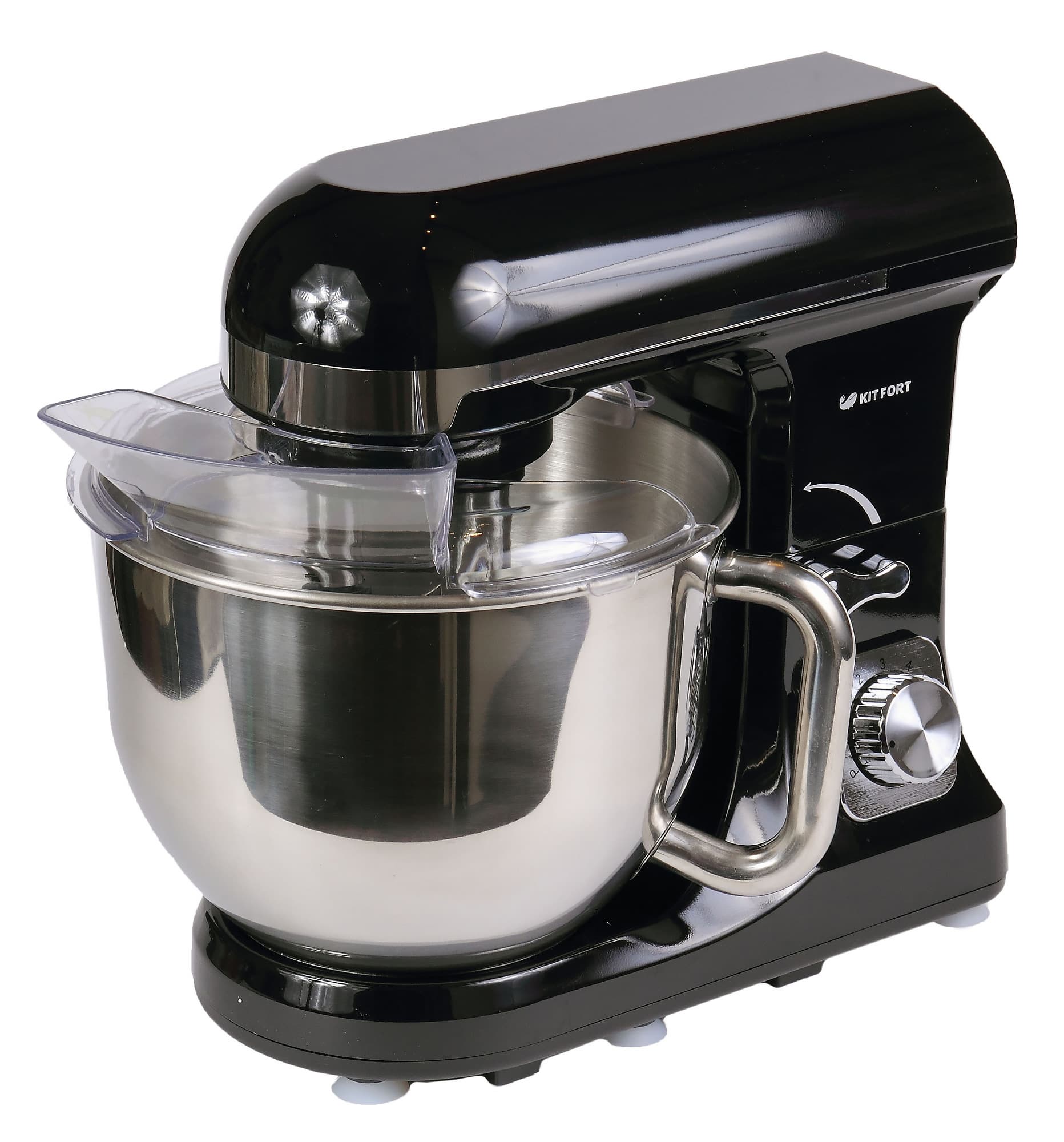 Как правило, управление планетарными миксерами не отличается сложностью. Не стал исключением Kitfort KT-1343. Весь процесс управления заключается в выборе и установке необходимой скорости. Регулятор скоростей находится на фронтальной стороне прибора. Ход регулятора пошаговый от первой до шестой скорости.