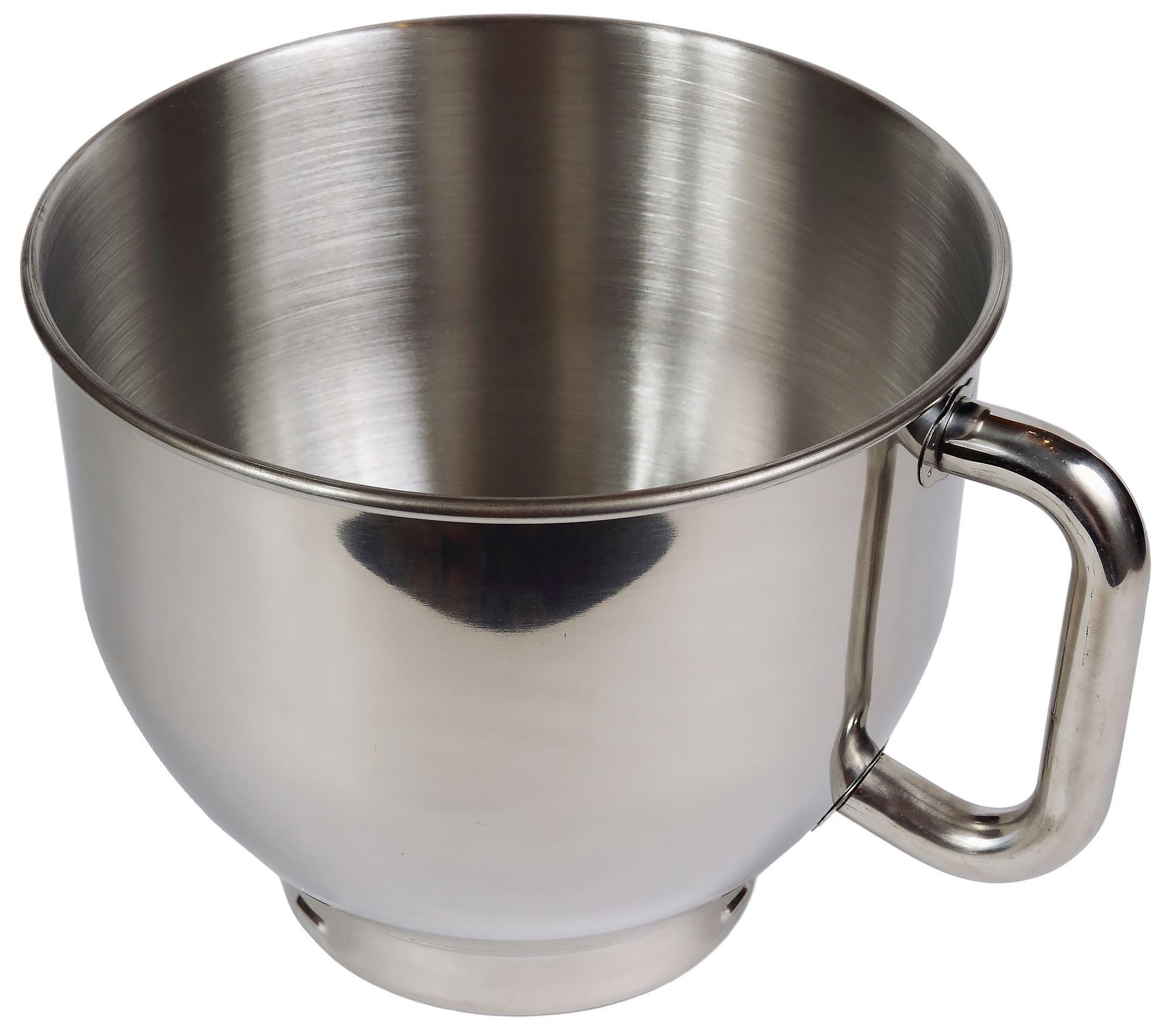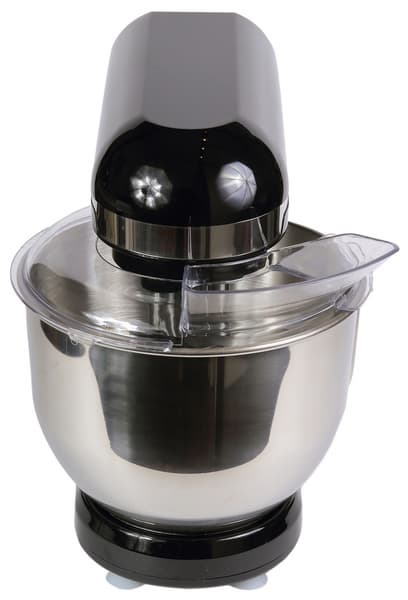 Чаша объемом в пять литров изготовлена из полированной нержавеющей стали. Форма стандартная для планетарных миксеров: цилиндрические стенки, переходящие к основанию в сферу. По центру дна имеется конусообразный выступ, что позволит взбивать даже малые количества продуктов. Чаша оснащена ручкой, что признано нами как удачное конструктивное решение — с ручкой удобнее не только сливать жидкое тесто или перекладывать в другую емкость готовое пюре или соус, но легче устанавливать и снимать дежу с базы миксера.