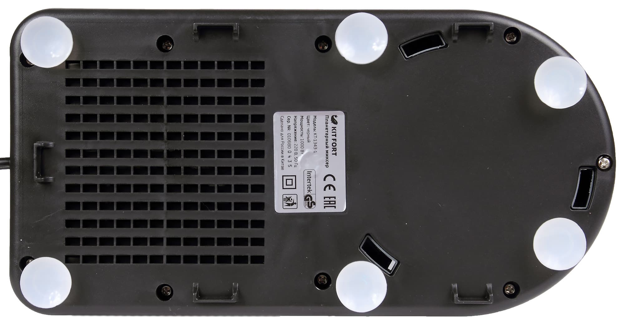 Со стороны дна прибор снабжен тремя парами присосок диаметром 2,5 см, которые противодействуют скольжению прибора во время работы и гасят вибрации, возникающие при замесе теста или взбивании на высоких скоростях. Ряды мелких вентиляционных отверстий в правой половине основания служат для отвода нагретого воздуха от мотора.