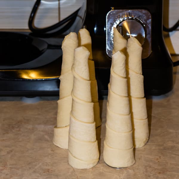 Раскатали и нарезали на тонкие полосы пласт бездрожжевого слоеного теста. Обернули лентами теста металлические формы для трубочек. Выпекали на 220 °C около 15 минут.