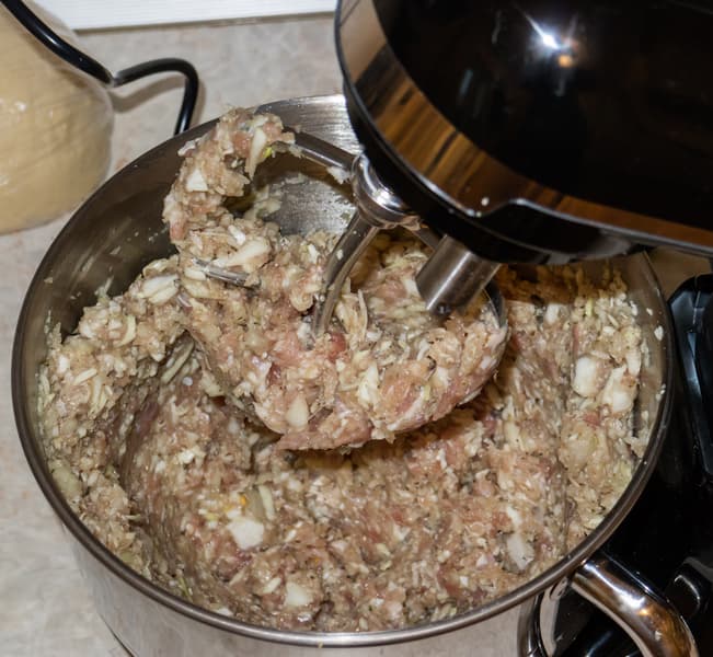 Манты (замес плотного теста и смешивание начинки)
