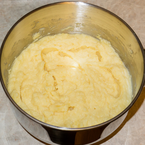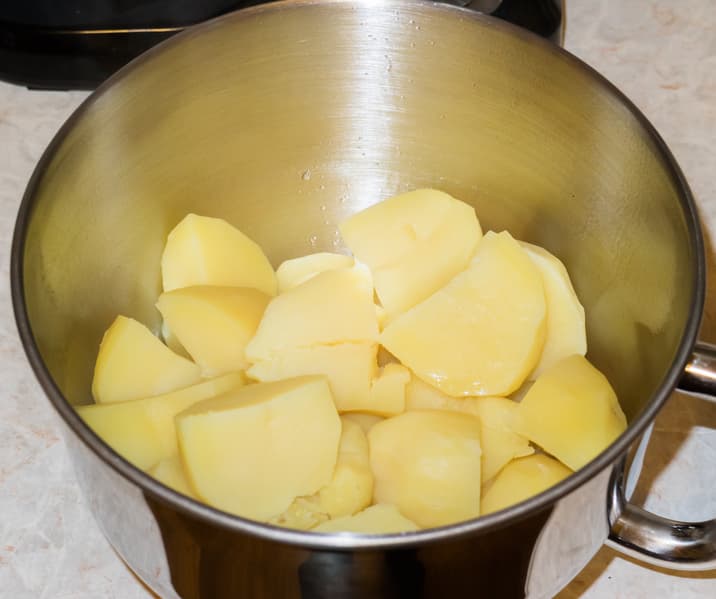 Отварили полтора килограмма картофеля, зафиксировали насадку для смешивания и приступили к работе на первой скорости. Пару раз останавливали миксер и ложкой стряхивали картофель со стенок чаши в середину.