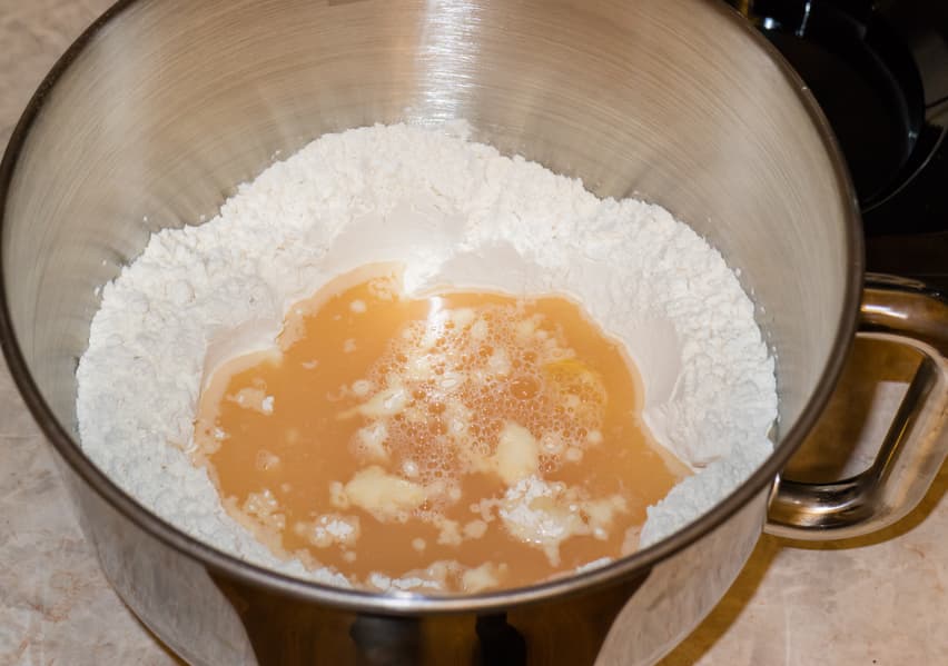 Установили два крюка для замеса плотного теста. В чашу насыпали 650 г муки, в большом стакане слегка взболтали два яйца с чайной ложкой соли, долили воды так, чтобы жидкая составляющая теста достигла веса 350 г. Влили жидкую часть в муку.
