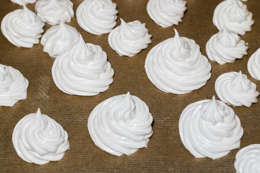 Остатки крема отсадили на противень, проложенный пергаментом. В результате получили большой противень пока еще сырых безе.