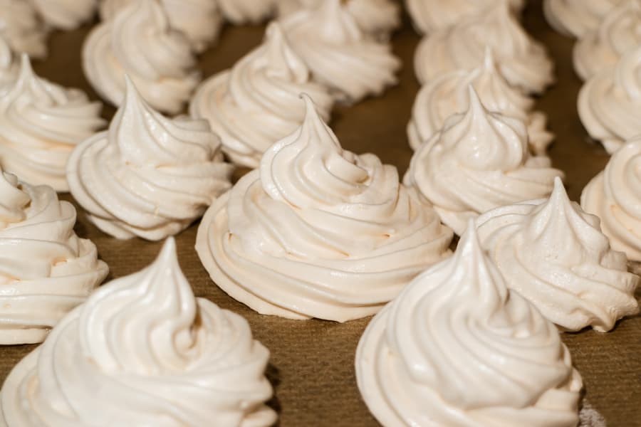 Подсушивали примерно в течение часа в режиме конвекции на 100 °C. Готовые безе приобрели красивый кремовый цвет, нежную и хрупкую структуру.
