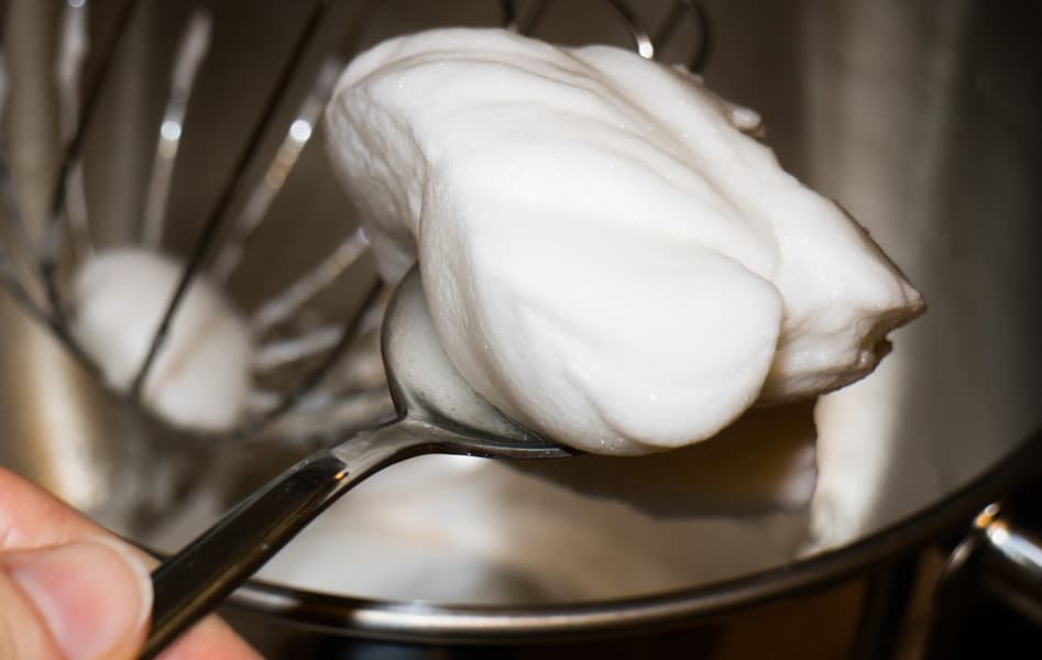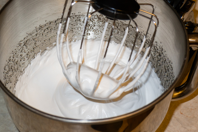 Кончик венчика касался белков, так что процесс с самого начала пошел довольно успешно. Скорость повышали постепенно — это очень важный момент при взбивании белков. Именно в этом случае белки насыщаются мелкими однородными пузырьками воздуха. До стадии твердых пиков продукт был доведен на пятой-шестой скорости. Всего время работы миксера составило четыре минуты.