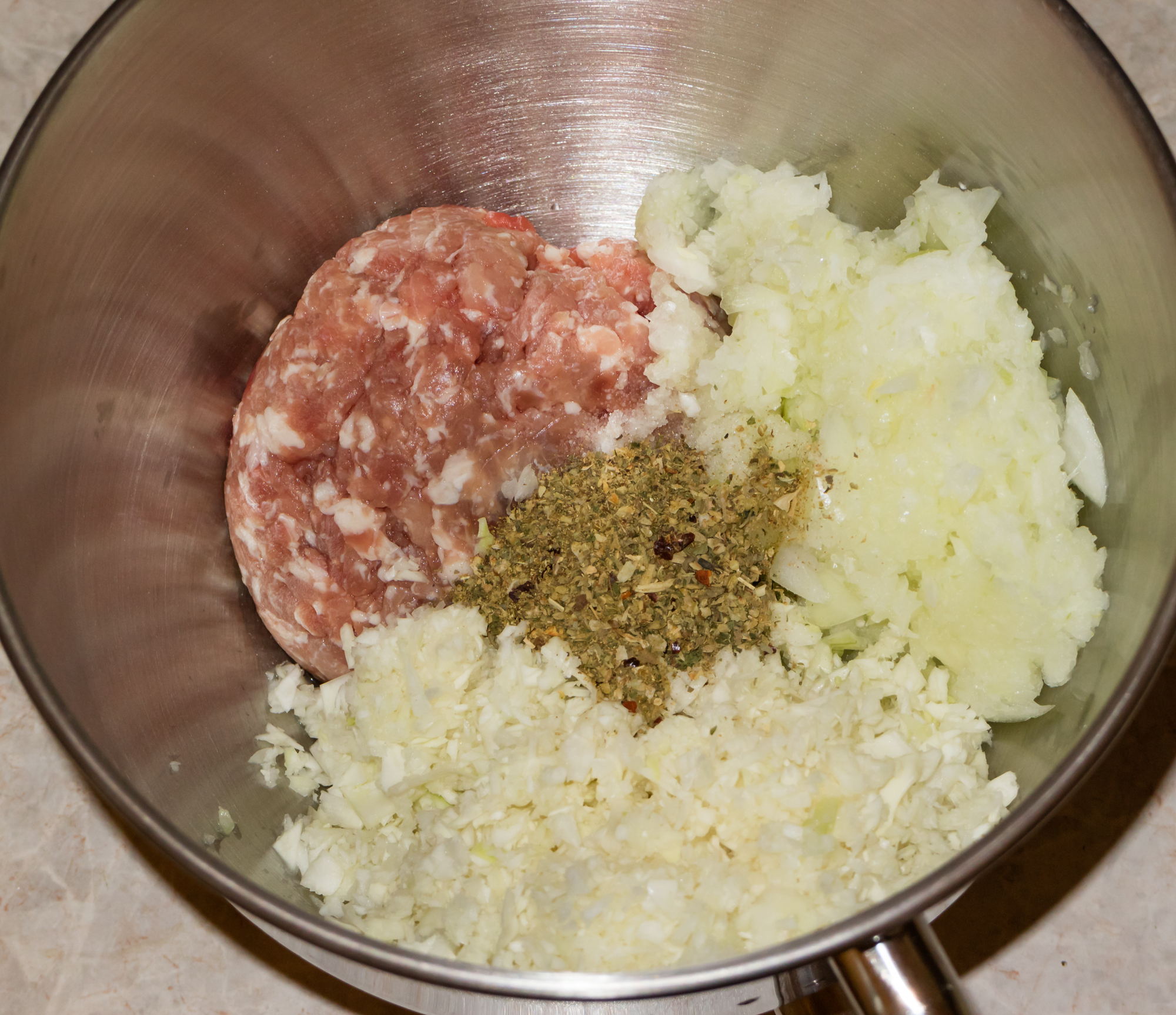 Отложили тесто в сторону и приступили к приготовлению начинки. В мясной фарш добавили измельченные репчатый лук и белокочанную капусту, соль, перец и смесь специй.