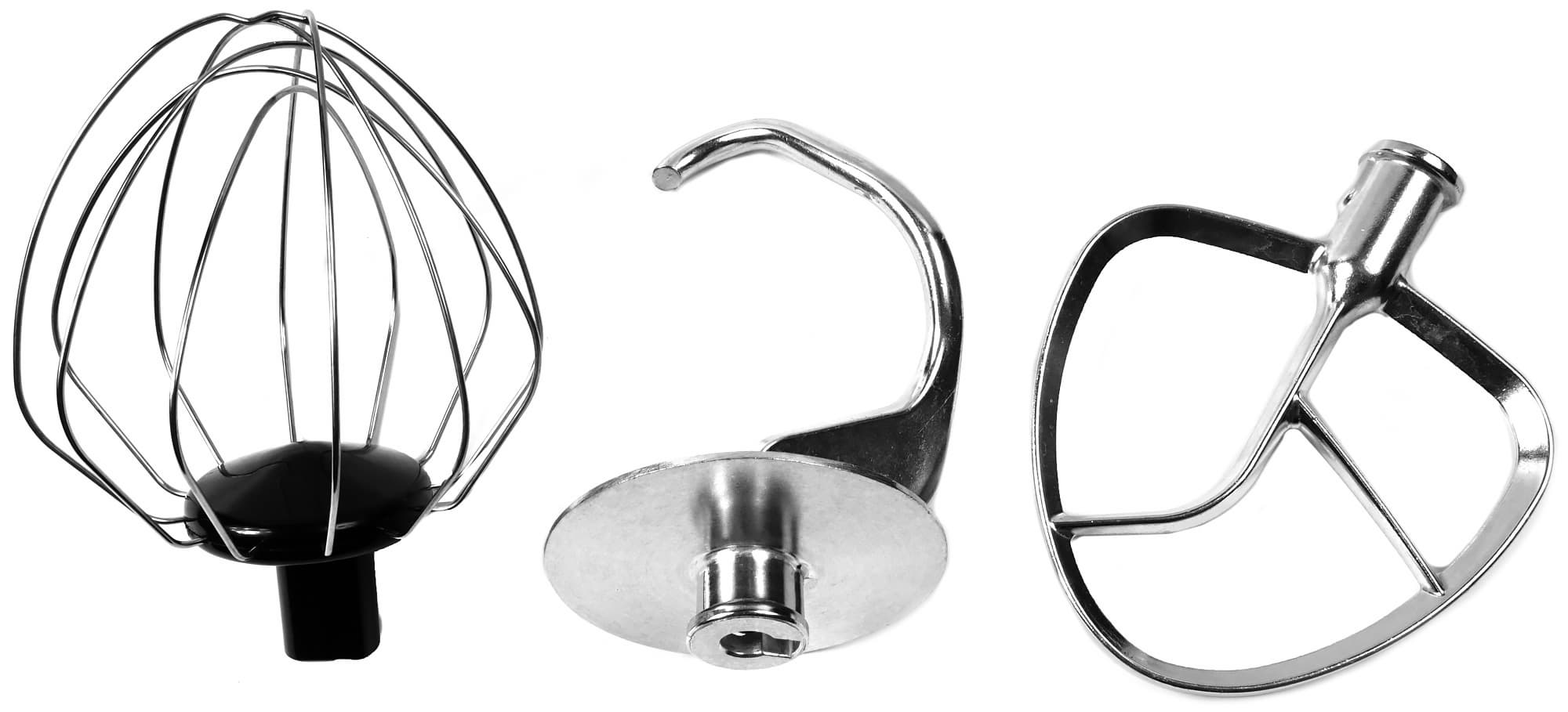 В комплект к миксеру входят три стандартные насадки: венчик для взбивания, крюк для теста и насадка для смешивания плотных ингредиентов. Венчик изготовлен из нержавеющей стали, головка крепления — из пластика черного цвета. Две другие насадки полностью изготовлены из алюминиевого сплава. Крюк для замешивания плотного теста в верхней части оснащен 9-сантиметровой защитной панелью, предохраняющей приводной вал от попадания на него влаги или муки.