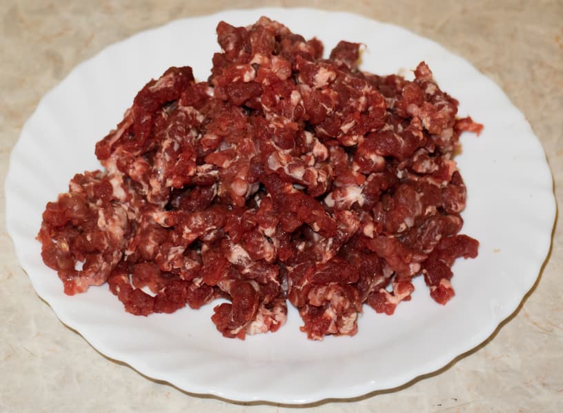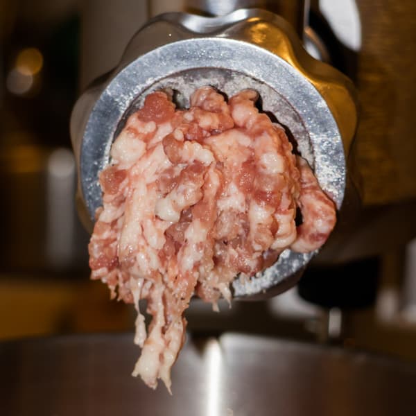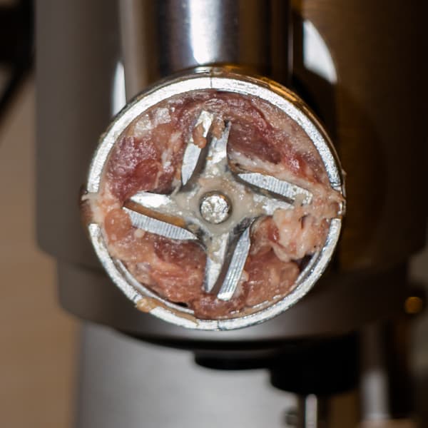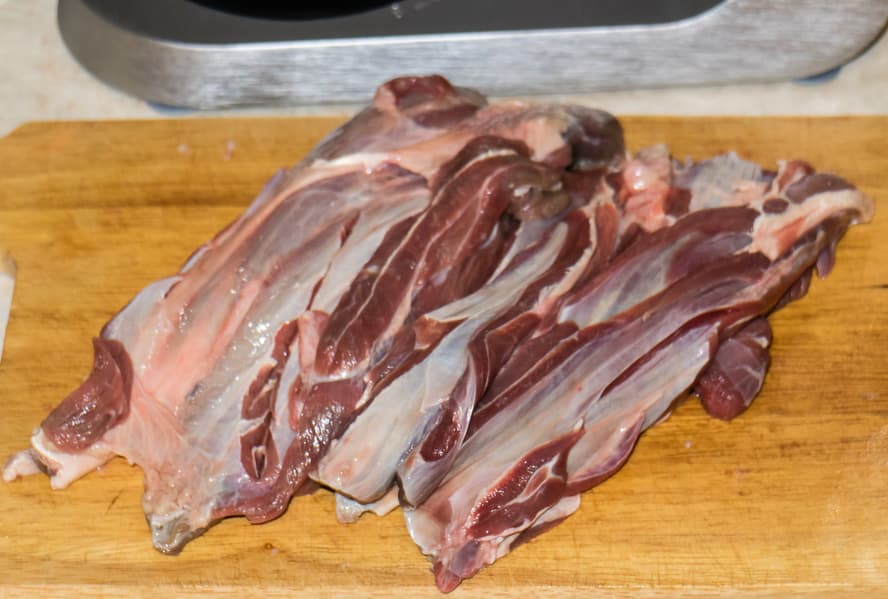 Мясо лопатки сложнее для помола, чем окорок. Мы же решили усложнить задачу и срезали мякоть, оставив лишь жилистые и жирные участки. Вес подготовленного сырья составил 1,22 кг.