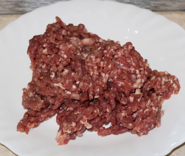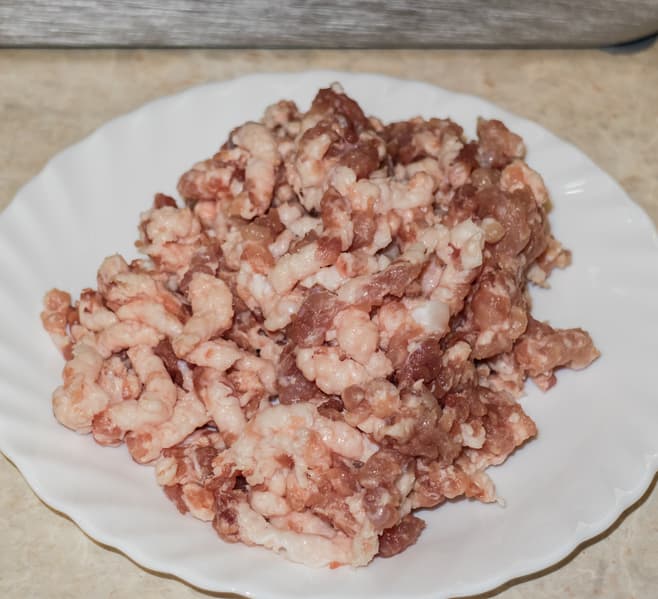 В это время подготовили начинку: пропустили через мясорубку 350 г свиного окорока и одну крупную луковицу. Добавили соль, перец, сухую зелень и немного холодной воды. Хорошо вымешали и слегка отбили фарш.