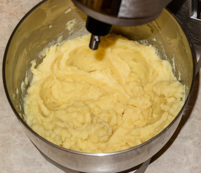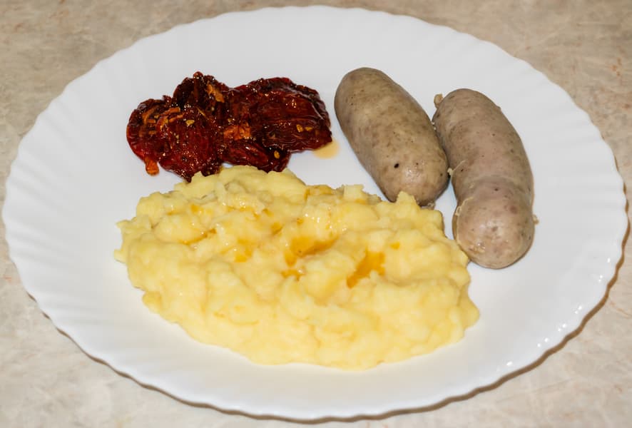 Раз уж мы сделали нежные сардельки из свинины, гарнир к ним тоже приготовим с помощью планетарного миксера. Отлично в этом случае подойдет картофельное пюре. Ровно килограмм очищенного картофеля отварили, слили воду, переложили в чашу миксера. Обработку производили на первой скорости.