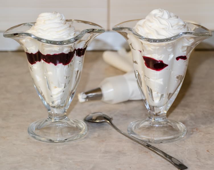Сливки отлично взбились. Плотная сливочная пена держит форму. Переложили продукт в кондитерский мешок и отсадили в креманки, приготовив десерт с перетертой с небольшим количеством сахара черной смородиной.