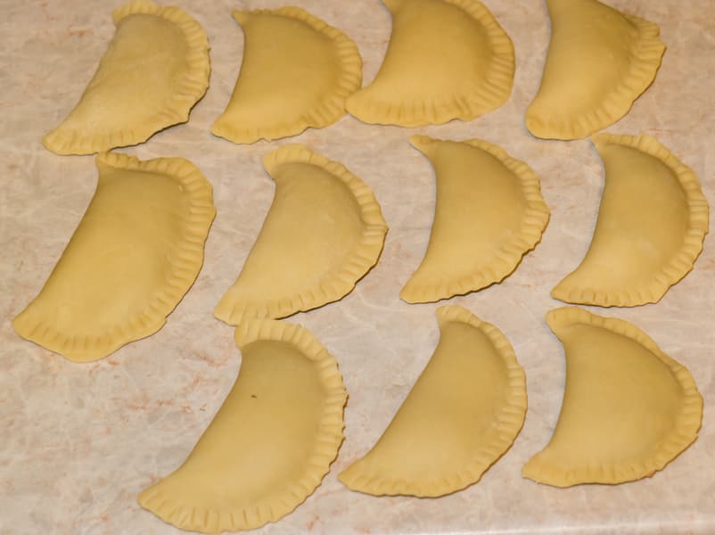Тесто за время отдыха действительно стало мягче. Раскатали пласт — тесто хоть и чрезвычайно плотное, но эластичное, не рвется. Прекрасно раскатывается без муки и не липнет ни к рукам, ни к столу и скалке. Небольшой тарелкой нарезали круглые заготовки. На одну половину выкладывали фарш, другой — накрывали и скрепляли края.