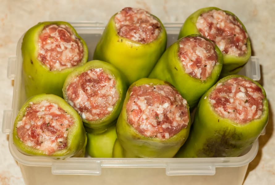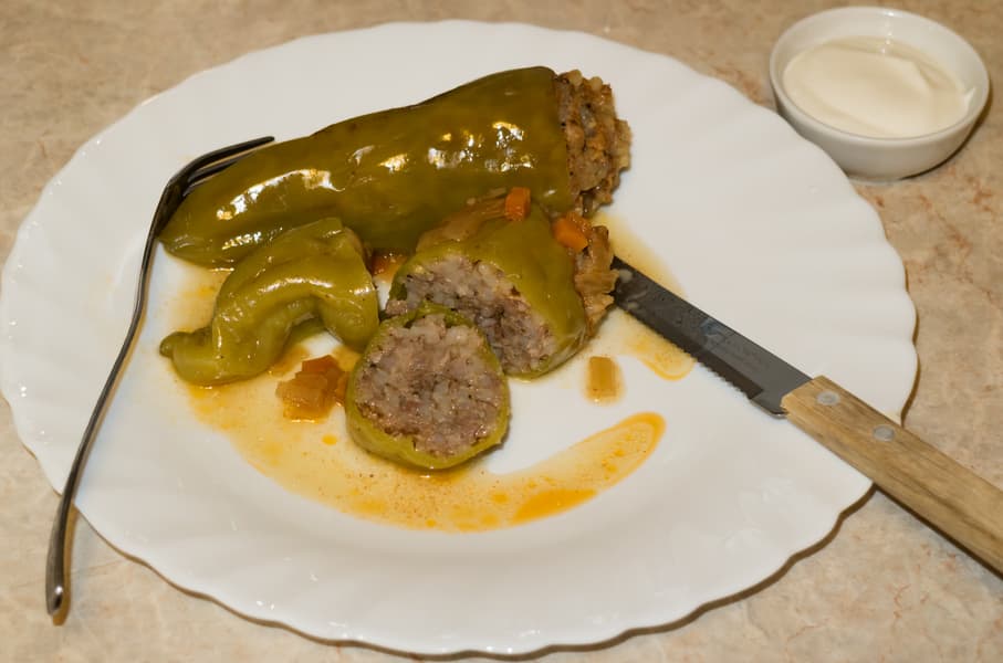 Посмотрели на полученную массу, а точнее ее немалое количество и решили попутно нафаршировать болгарский перец. Помыли перец, срезали верхнюю часть, удалили сердцевину с косточками. Плотно утрамбовали начинку и уложили фаршированные перцы в чашу мультиварки. Поджарили лук и морковку, добавили туда же. Долили воды, так, чтобы она слегка покрыла перцы, немного соли и специй. Тушили под давлением 20 минут.
