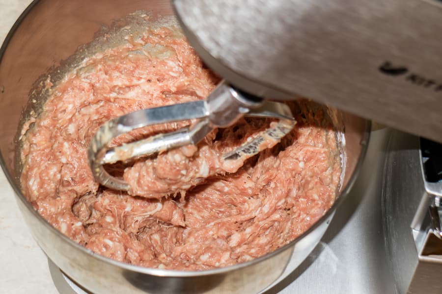В 1 кг полученного в первом тесте фарша из свиного окорока добавили 1 столовую ложку соли, 1 стакан холодного молока, 1 столовую ложку крахмала, сухой чеснок и свежемолотый черный перец. Подсоединили насадку для перемешивания, установили чашу с фаршем и добавками в гнездо планетарного миксера и запустили процесс вымешивания начинки для сарделек. Сначала работали на третьей скорости, затем увеличили ее до четвертой. Всего процесс получения однородной сарделечной массы занял около 10 минут. Миксеру задача показалась совсем простой — при работе на четвертой скорости мощность составляла около 105 Вт. Затем убрали фарш в холодильник на час.