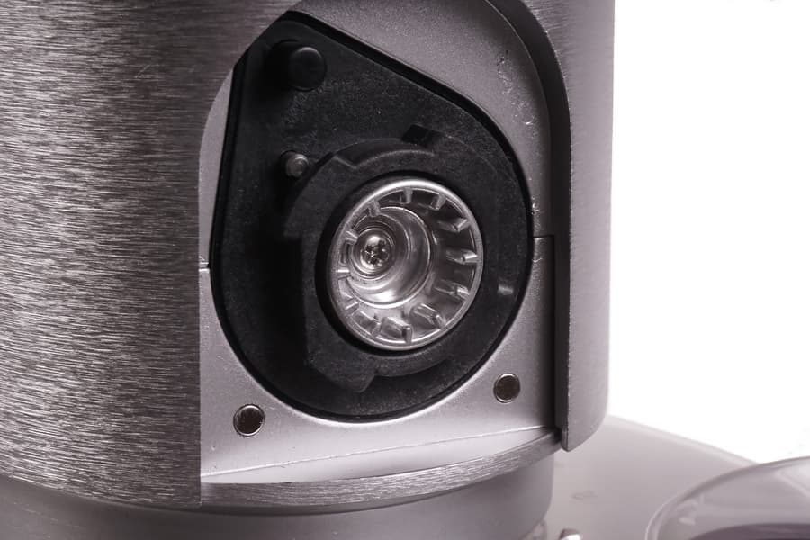 С левой стороны откидной головки видна пластиковая заглушка, которая прикрывает место установки насадки-мясорубки. Материал соединения приводного вала мотора и шнека мясорубки — металл-металл. В узкой верхней части пластиковой муфты, изготовленной в форме капли, находится кнопка разблокировки насадки.